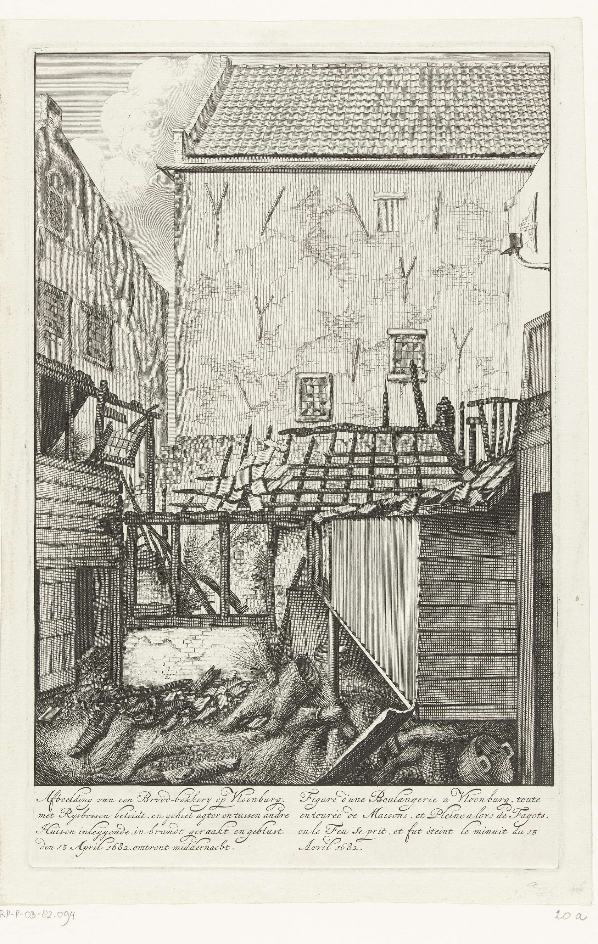 Ruïne van een bakkerij op Vlooienburg te Amsterdam, in brand geraakt en geblust op 13 april 1682. Met onderschrift van 4 regels in het Nederlands en 4 regels in het Frans. Plaat 20 in de herdruk van het Brandspuitenboek van Jan van der Heyden uit 1735.