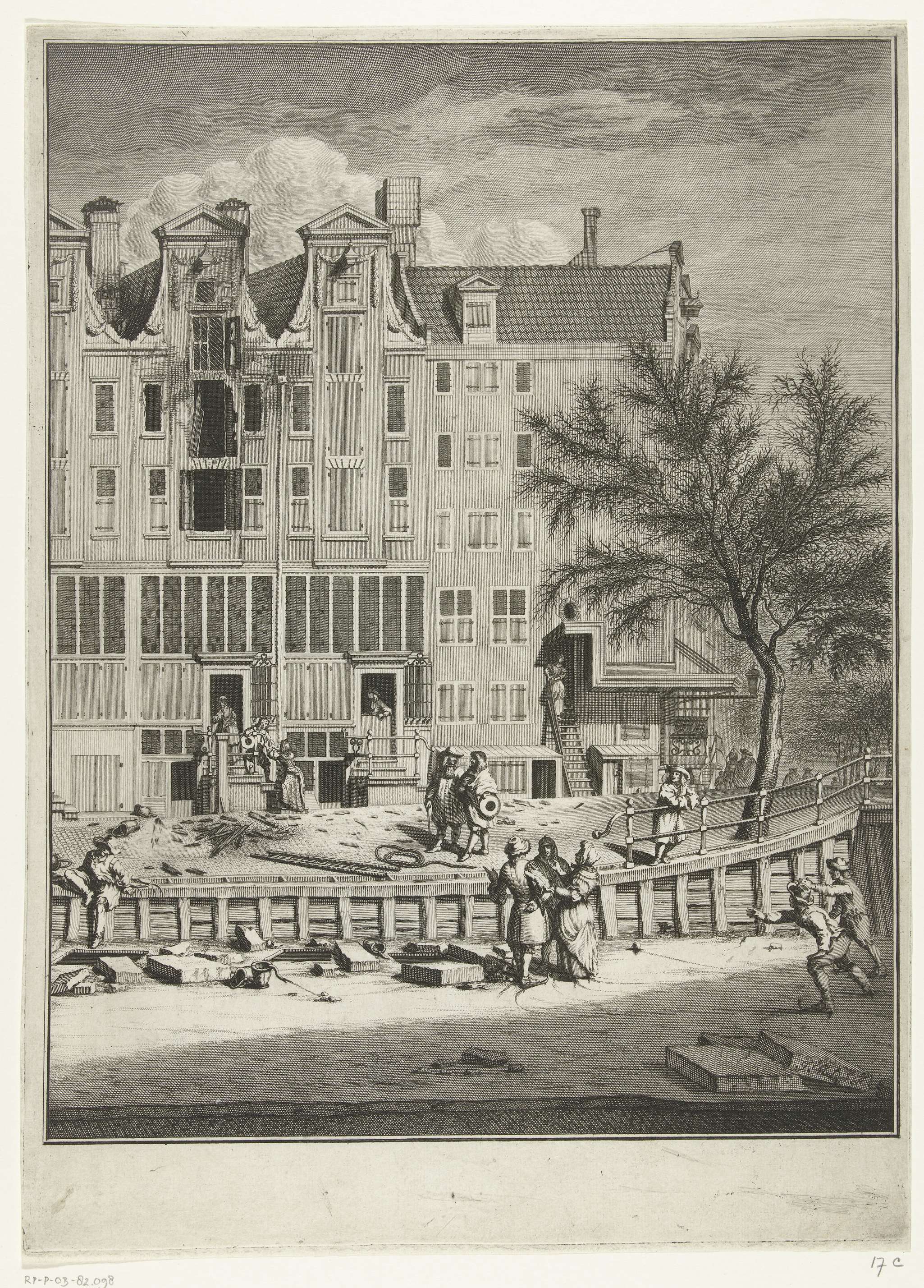 Uitgebrand huis op de Leidsegracht, bij de hoek met de Herengracht, te Amsterdam. Na de brand op 12 januari 1684 tijdens een zeer strenge vorst. Geblust met slangbrandspuiten. Met toeschouwers op het ijs van de bevroren gracht. Latere staat (met de letter) is plaat 17 in het Brandspuitenboek van Jan van der Heyden.