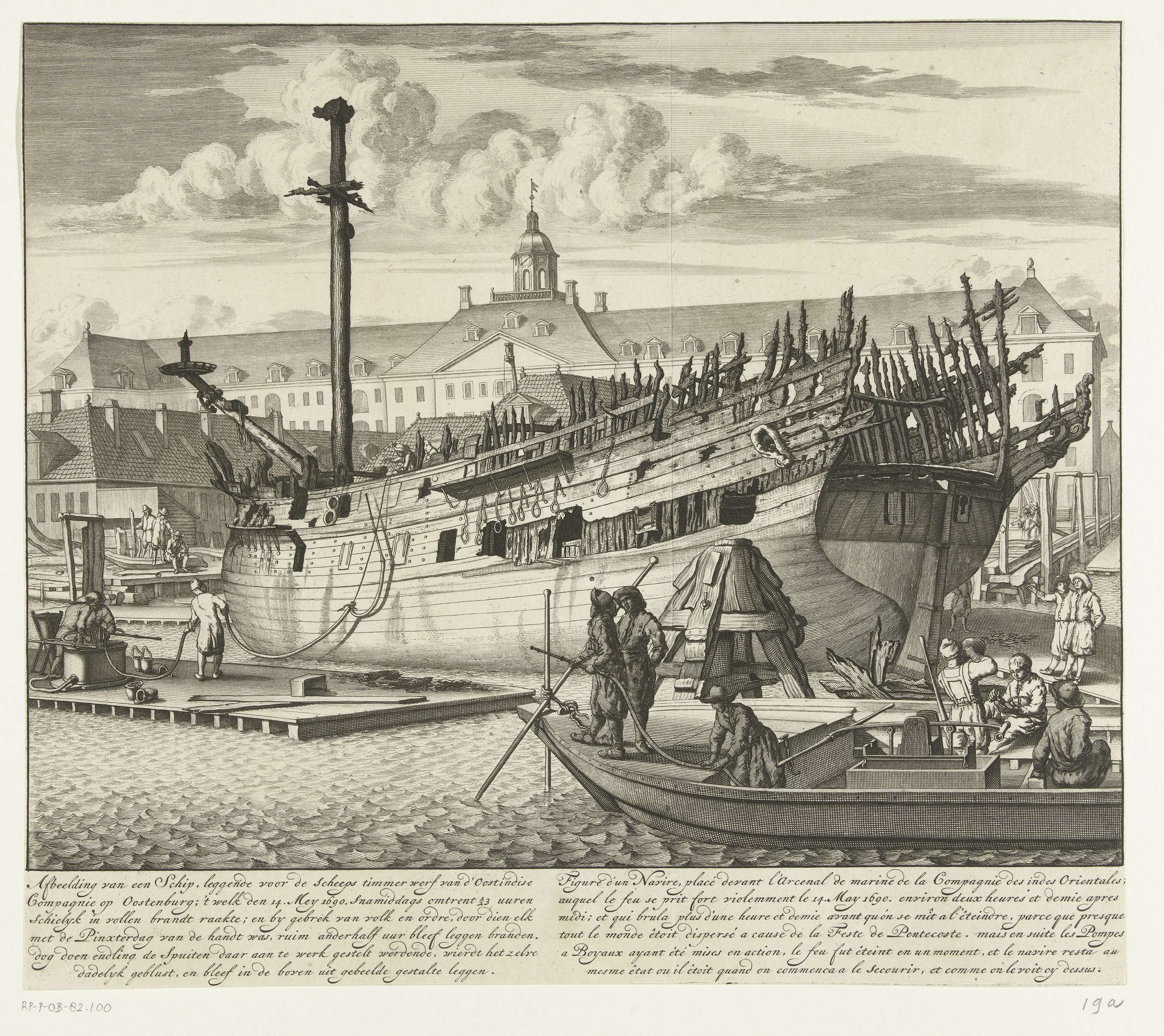 Schip in aanbouw op de VOC-scheepswerf op Oostenburg dat in brand raakte maar door het blussen met de slangbrandspuit gered kon worden, 14 mei 1690. Met zesregelig onderschrift in het Nederlands en Frans. Plaat 19 in het Brandspuitenboek van Jan van der Heyden.
