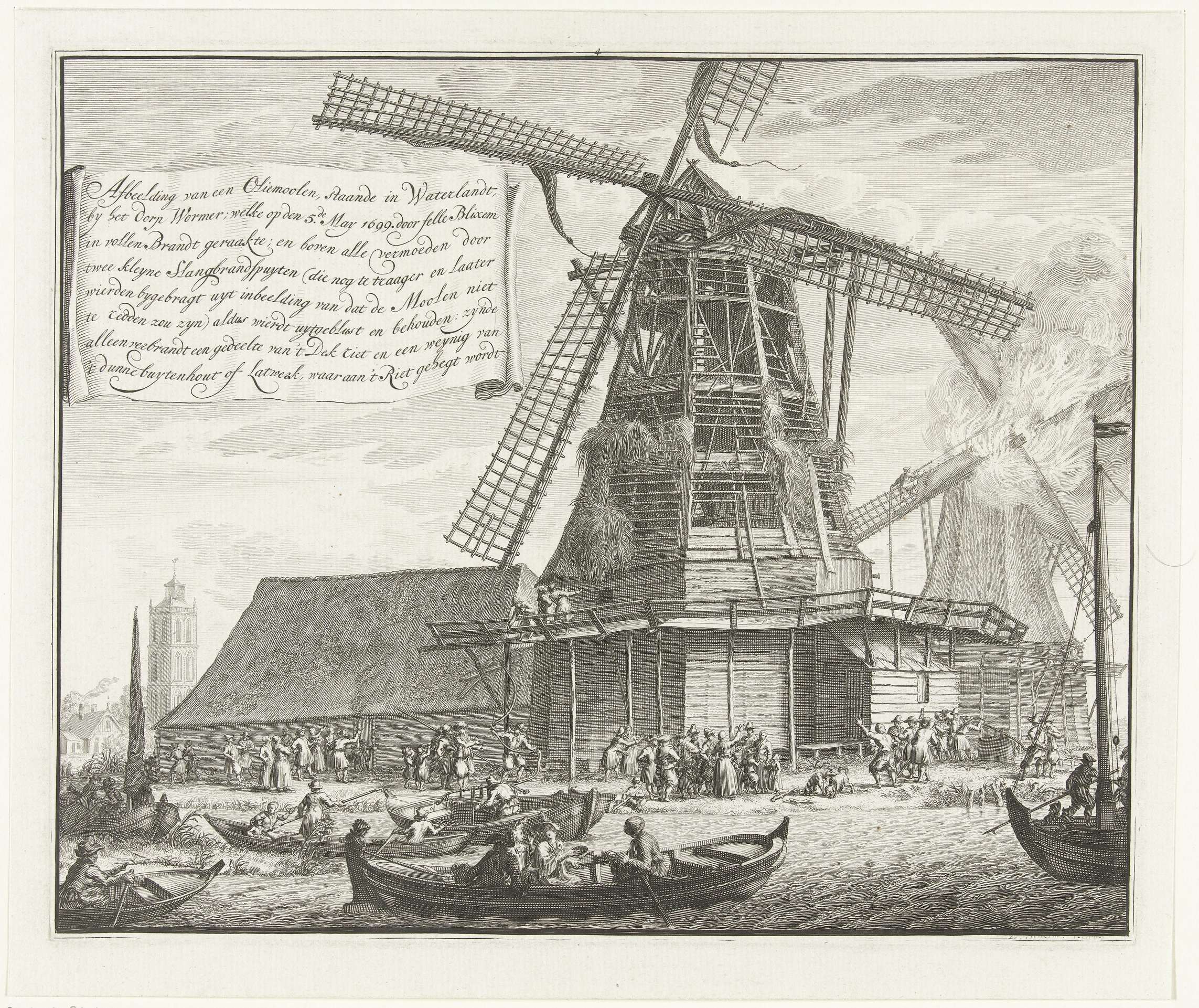 Zicht op oliemolens De Keizer (voorgrond) en De Zeug (achtergrond) bij Wormer. Oliemolen De Zeug werd op 5 mei 1699 getroffen door de bliksem en vatte vlam. Van oliemolen De Keizer is uit voorzorg het rietdek verwijderd om brand door overwaaiende vonken te voorkomen. Door het blussen met een slangbrandspuit is De Zeug grotendeels bewaard ...