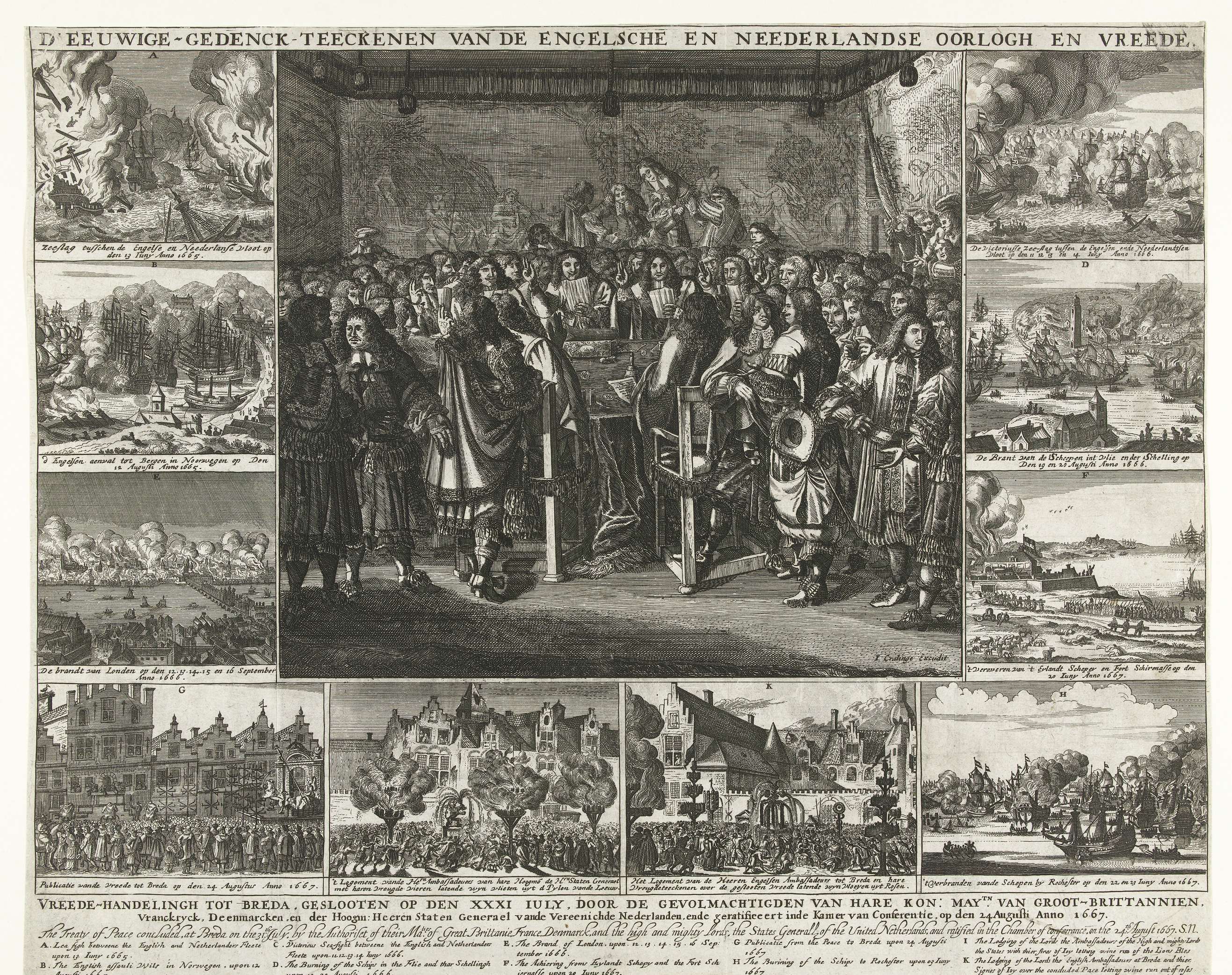 Vrede van Breda, 31 juli 1667, waarmee een eind kwam aan de Tweede Engelse Oorlog. Centrale voorstelling van het beëdigen van het vredesverdrag, hieromheen negen kleinere voorstellingen van zeeslagen en gebeurtenissen uit de oorlog, de grote brand van Londen en de bekendmaking en viering van de vrede te Breda op 24 augusts 1667. Onderaan de ...