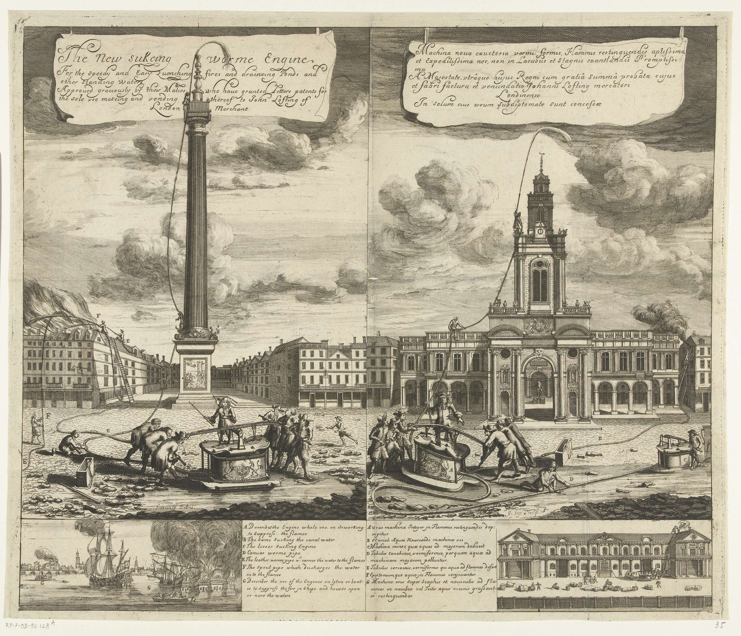 Voorstelling van het gebruik van een nieuw type slangbrandspuit uitgevonden door de Engelsman John Lofting, tegen de achtergrond van gebouwen in Londen, ca. 1690-1700. Links bij het monument ter nagedachtenis aan de grote brand van 1666: Monument to the Great Fire of London, rechts een tweede voorstelling met een demonstratie voor de Royal Exchange (Beurs). ...