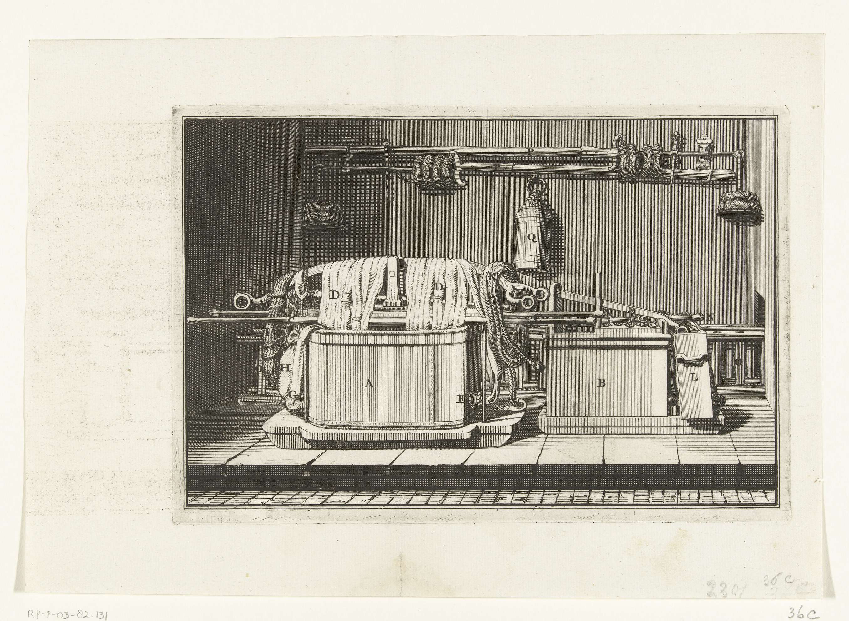 Een voorstelling hoe de slangbrandspuit en pomp in het brandspuithuisje opgeborgen dient te worden na gebruik. Gebruikt in de instructie over het correcte gebruik en bewaring van de slangbrandspuiten, 1692 en ca. 1695. Behoort tot de bijprenten bij het Brandspuitenboek van Jan van der Heyden.