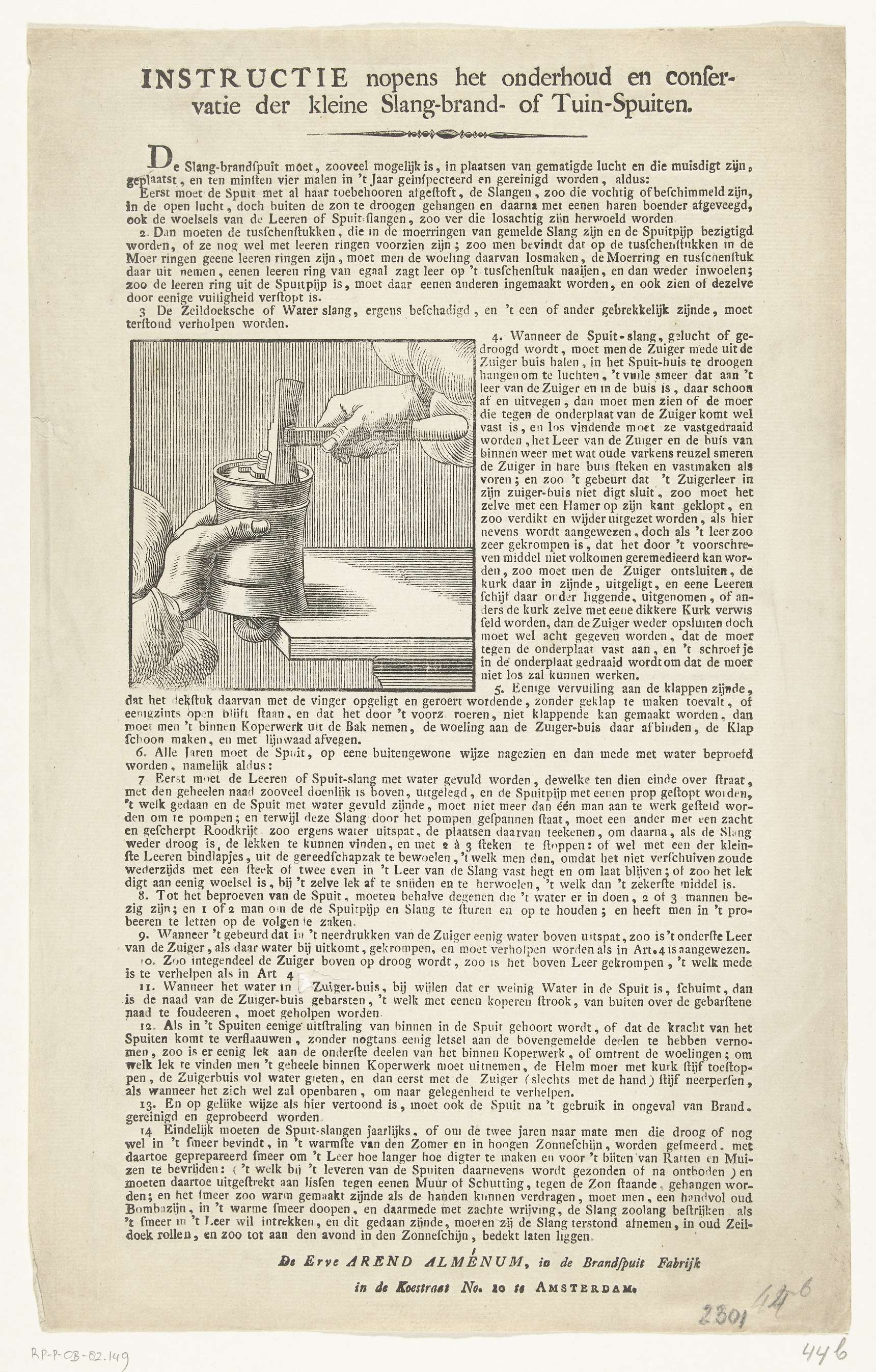 Instructie over het onderhoud van de kleine slangbrandspuiten, ca. 1800