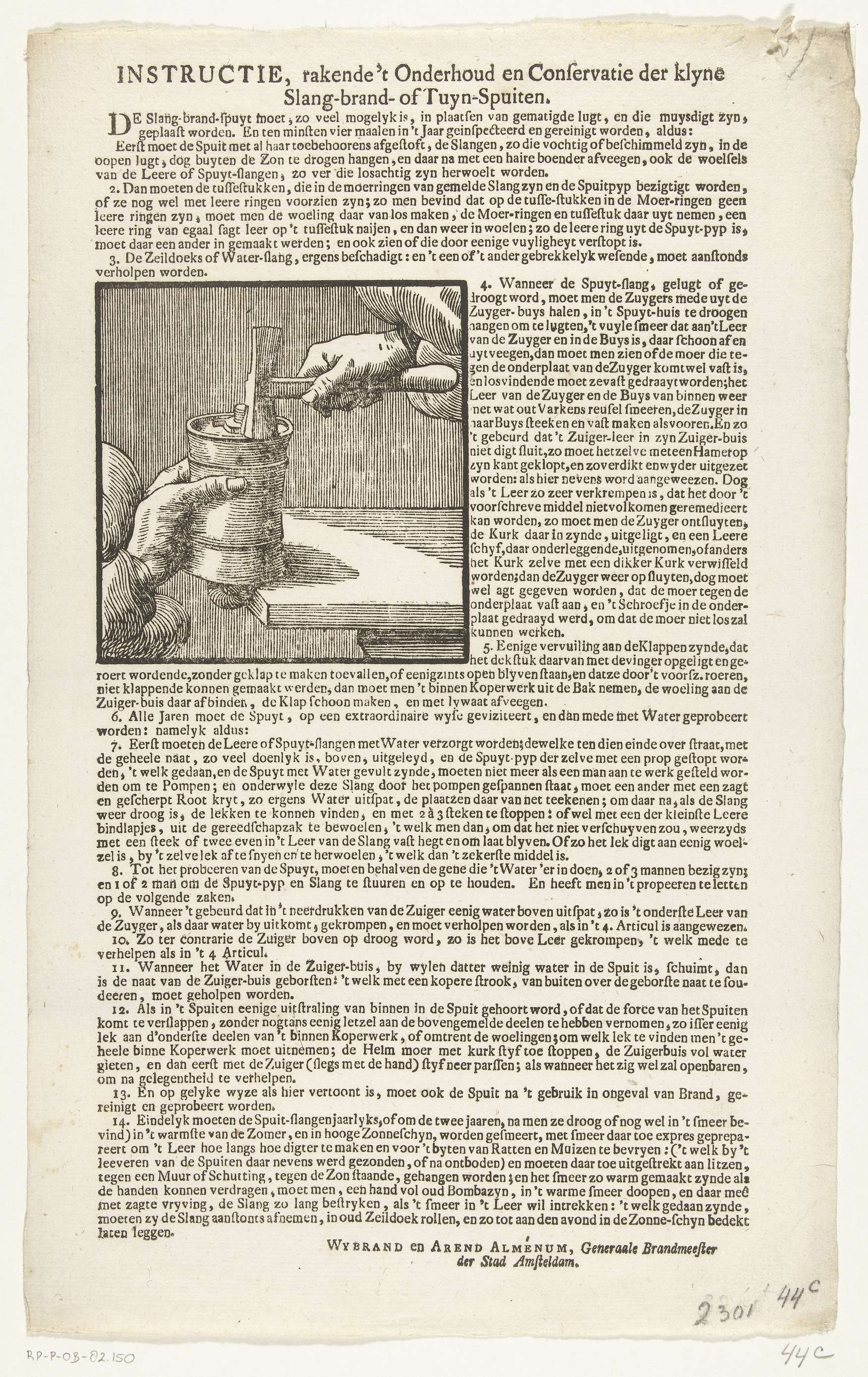 Instructie over het onderhoud van de kleine slangbrandspuiten, ca. 1765
