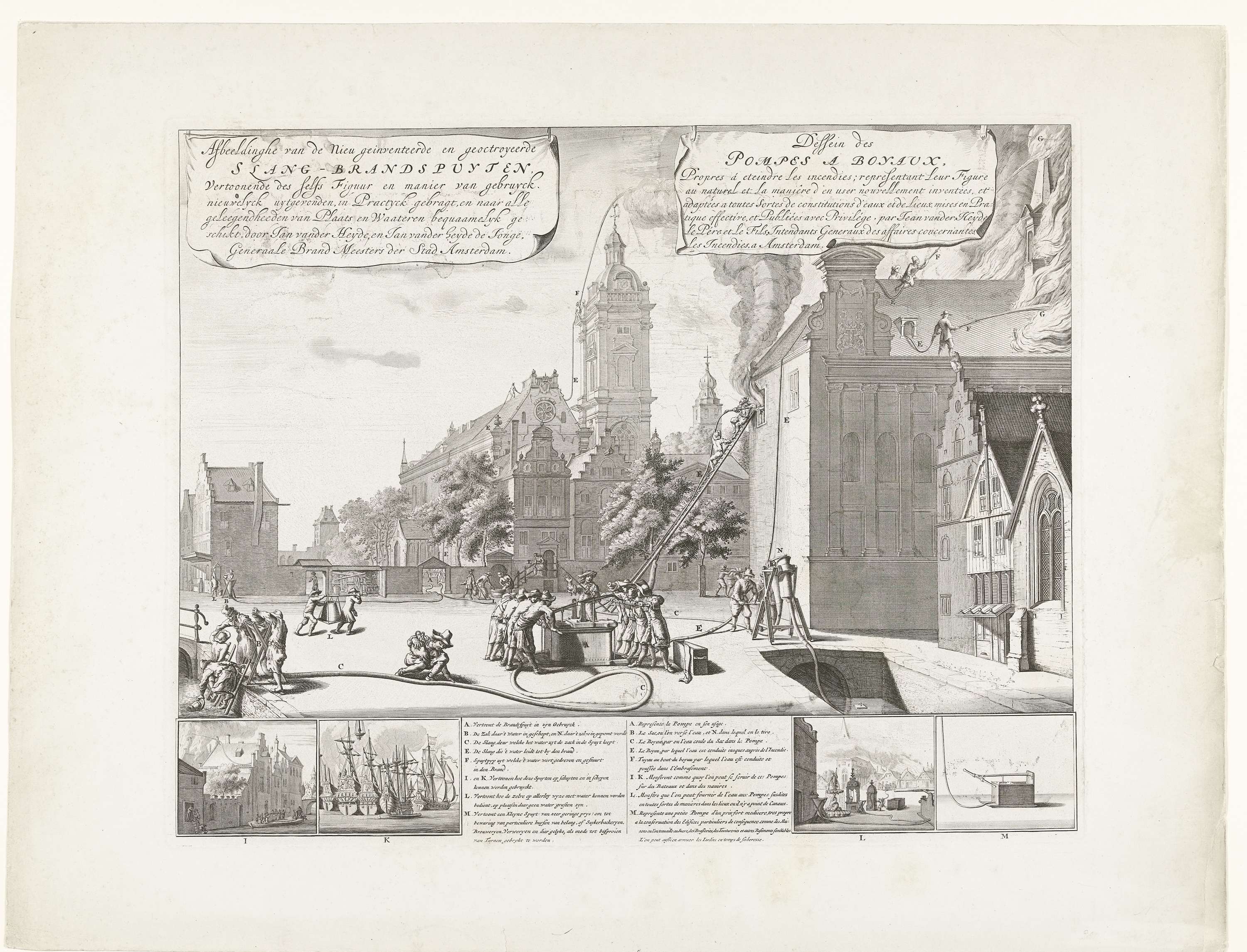 Blad met een grote voorstelling van de toepassing van de nieuwe slangbrandspuiten van Jan van der Heyden en Jan van der Heyden de Jonge bij het blussen van een brand in een gebouw in een imaginaire stad. Bovenaan twee doeken met de titels in het Nederlands en Frans. Onderaan vier kleine voorstellingen van branden in ...