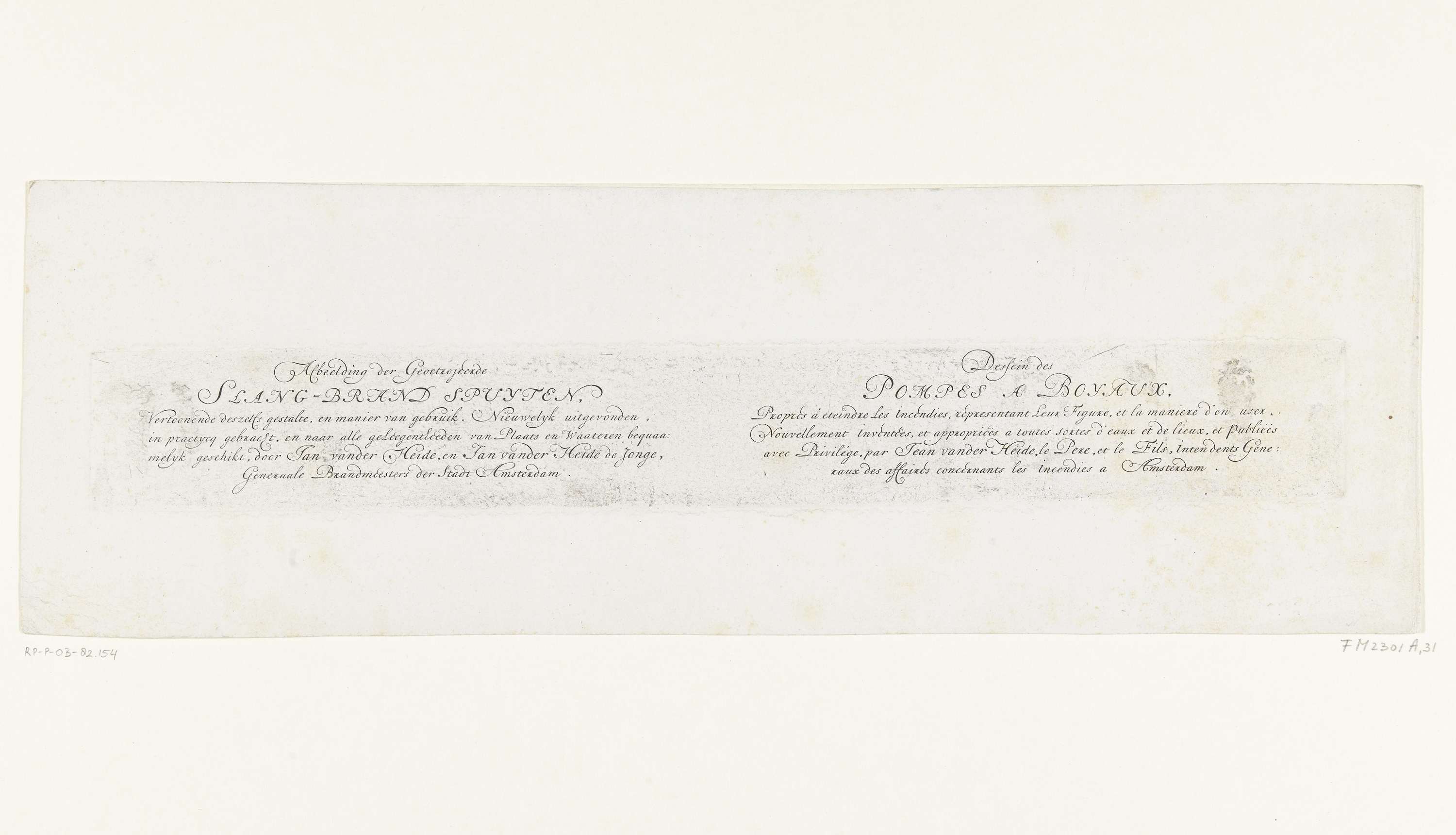 De plaat met de gegraveerde titels in het Nederlands en Frans, gebruikt bij de prent over het gebruik van de nieuwe brandspuitslangen, 1677. Behoort tot de bijprenten bij het Brandspuitenboek van Jan van der Heyden.