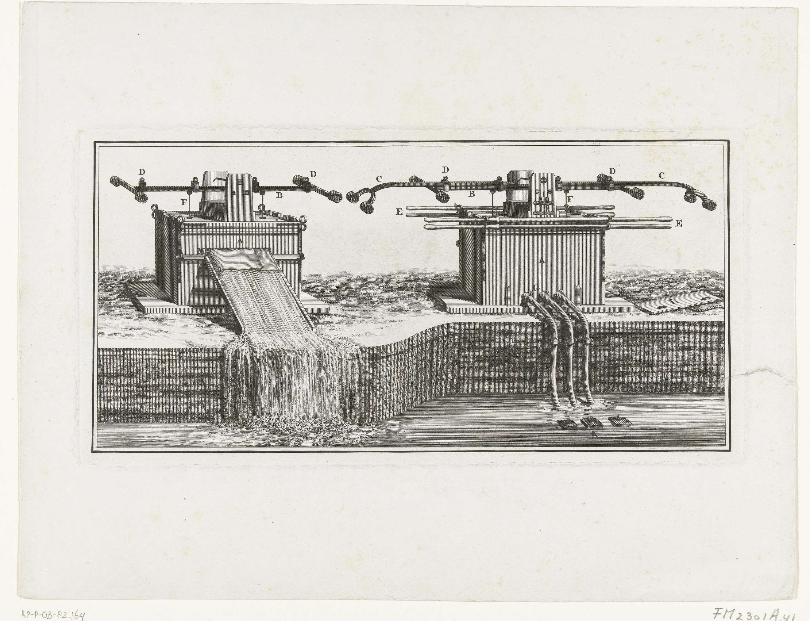 Blad met instructie over het correcte gebruik van de dubbele zuigpompen bij de slangbrandspuiten, ca. 1750-1760. Behoort tot de bijprenten bij het Brandspuitenboek van Jan van der Heyden.
