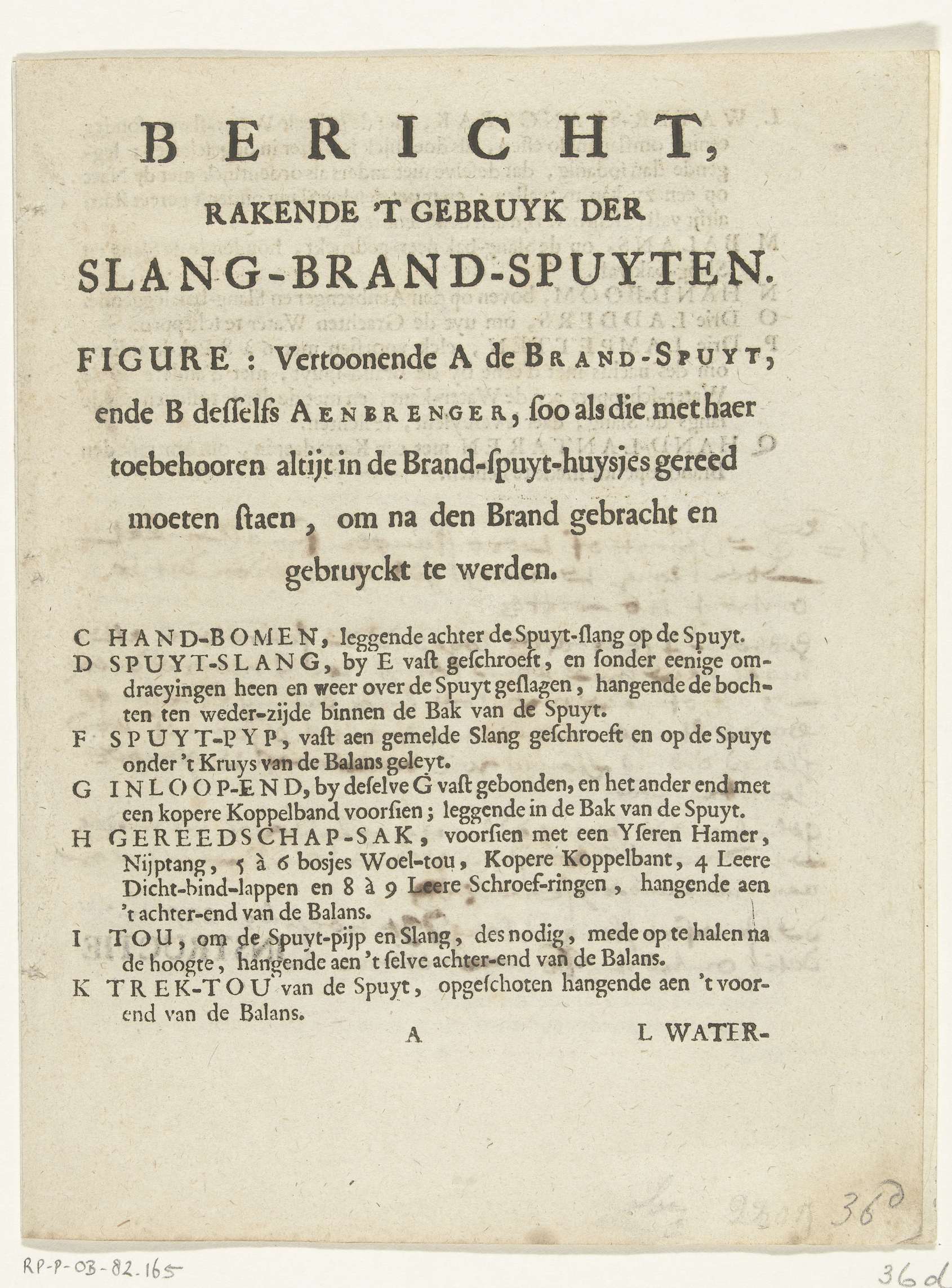 Gevouwen boekje van drie bladen met gedrukte instructies voor het correcte gebruik en bewaring van de slangbrandspuiten, ca. 1695. Met een verklaring van de letters A-Q (verwijzend naar een voorstelling). Met op de tweede bladzijde geschreven annotaties, de instructie voor gebruik in het geval van brand in 15 punten en een plaatje hoe een lekkage ...