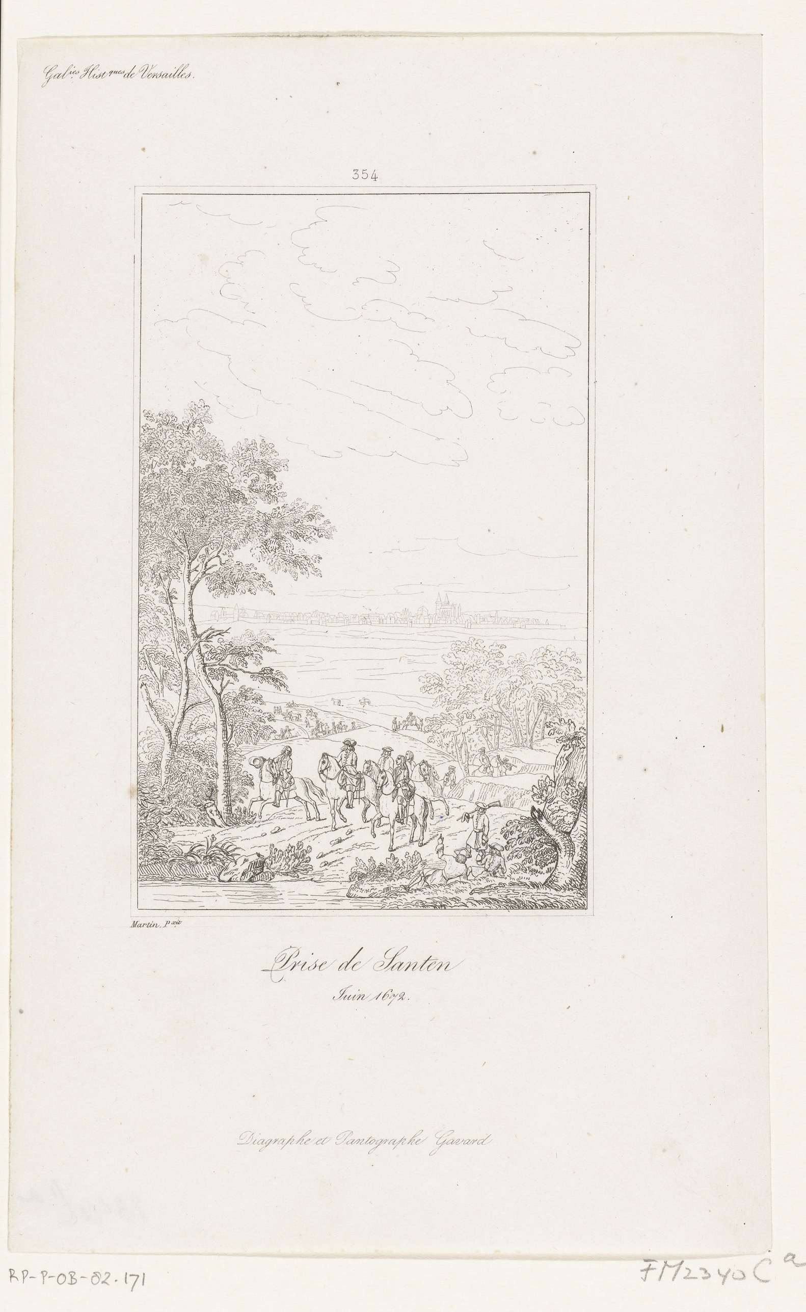 Verovering van Xanten door het Franse leger, 8 juni 1672. Officieren te paard bij een beek, op de achtergrond het profiel van de stad. Naar het schilderij in het paleis van Versailles. Genummerd bovenaan: 354.