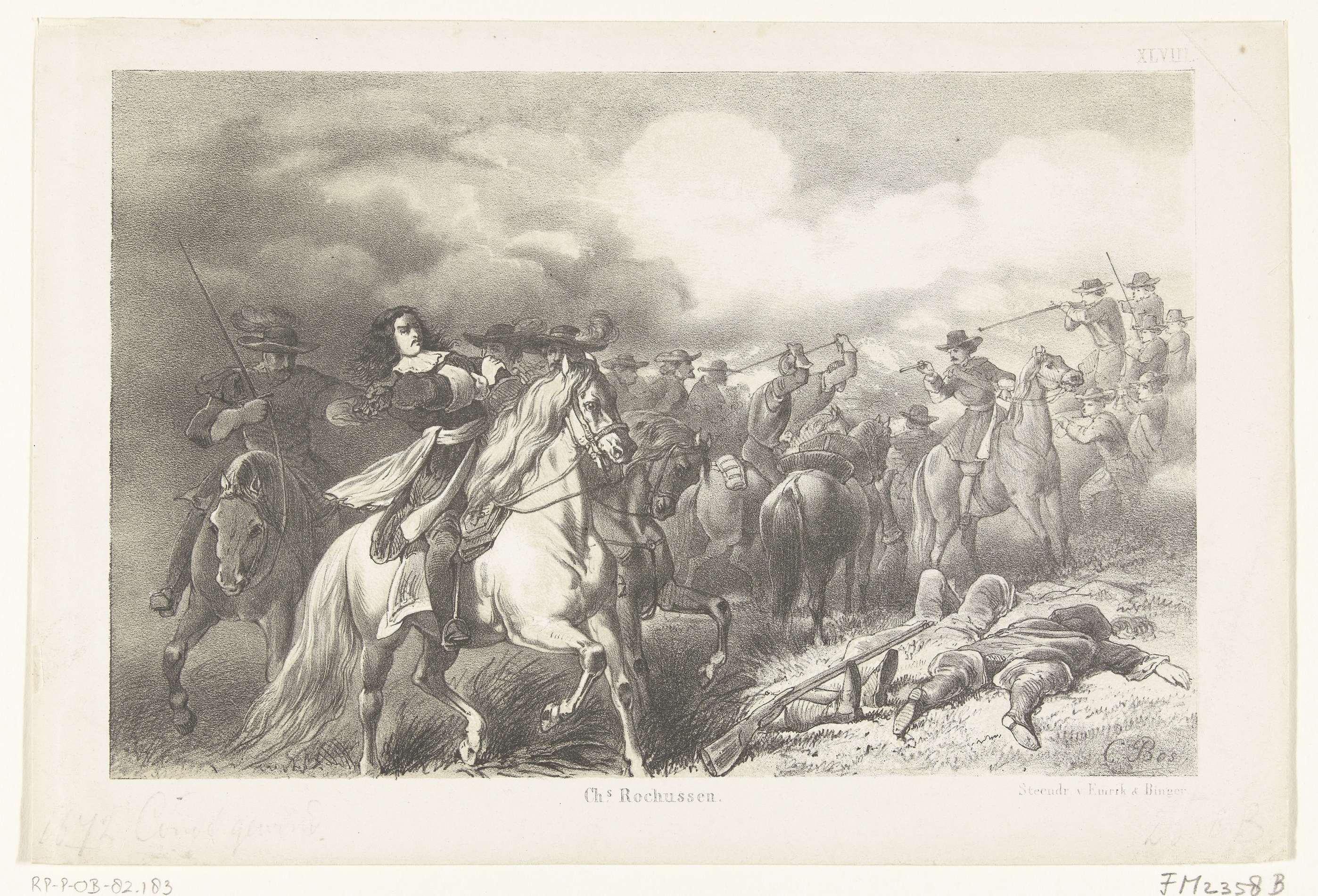 De prins van Condé raakt gewond tijdens de gevechten na de overtocht over de Rijn, 11 juni 1672. Ruitergevecht tussen Staatse en Franse ruiters. Gemerkt rechtsboven: XLVIII.