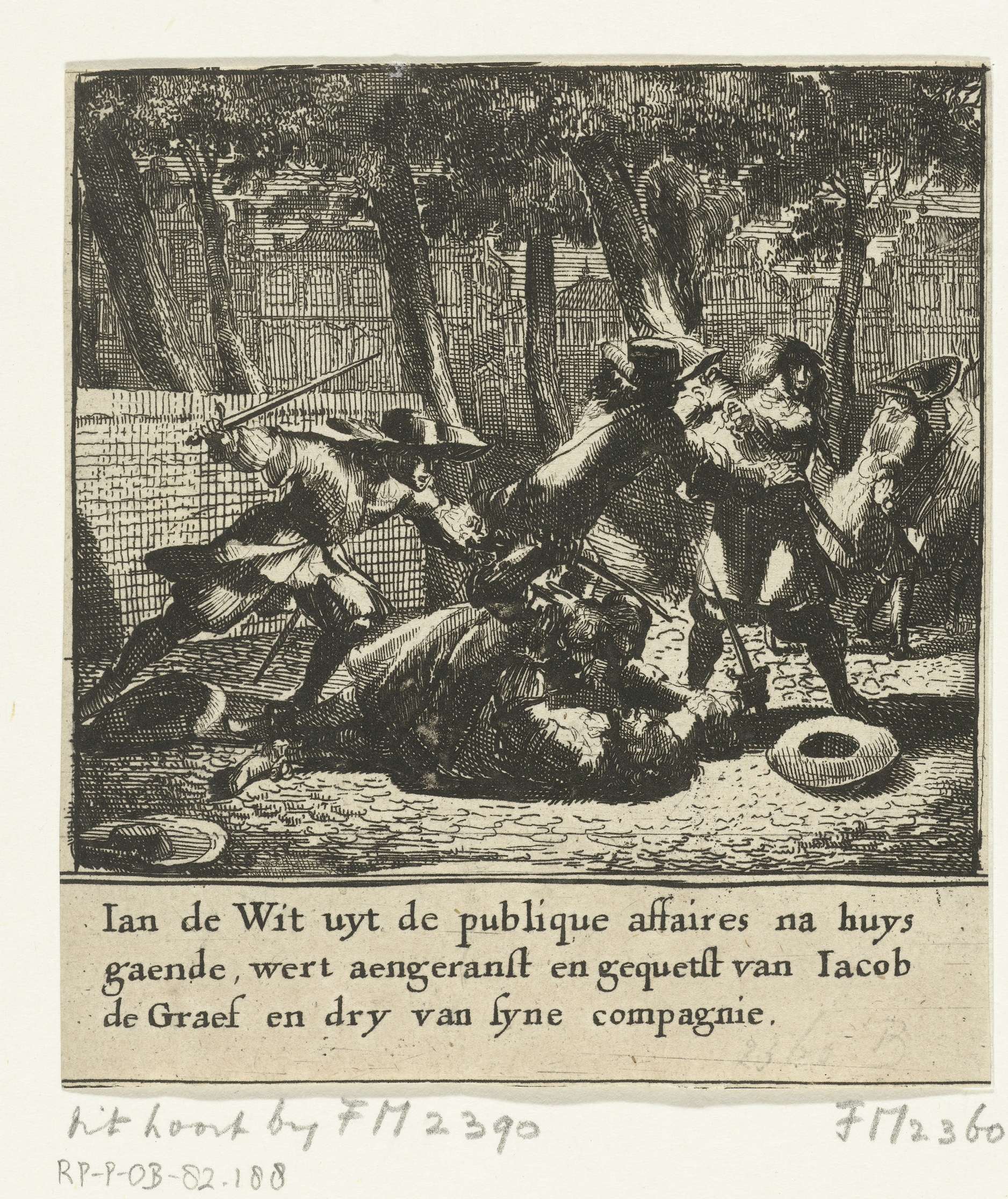 Raadpensionaris Johan de Witt wordt op straat aangevallen door een groep gewapende mannen onder leiding van Jacob de Graef en raakt zwaar gewond, juni 1672. Fragment van de grote prent over de gebroeders De Witt: Witten Wonder Spiegel (1675).