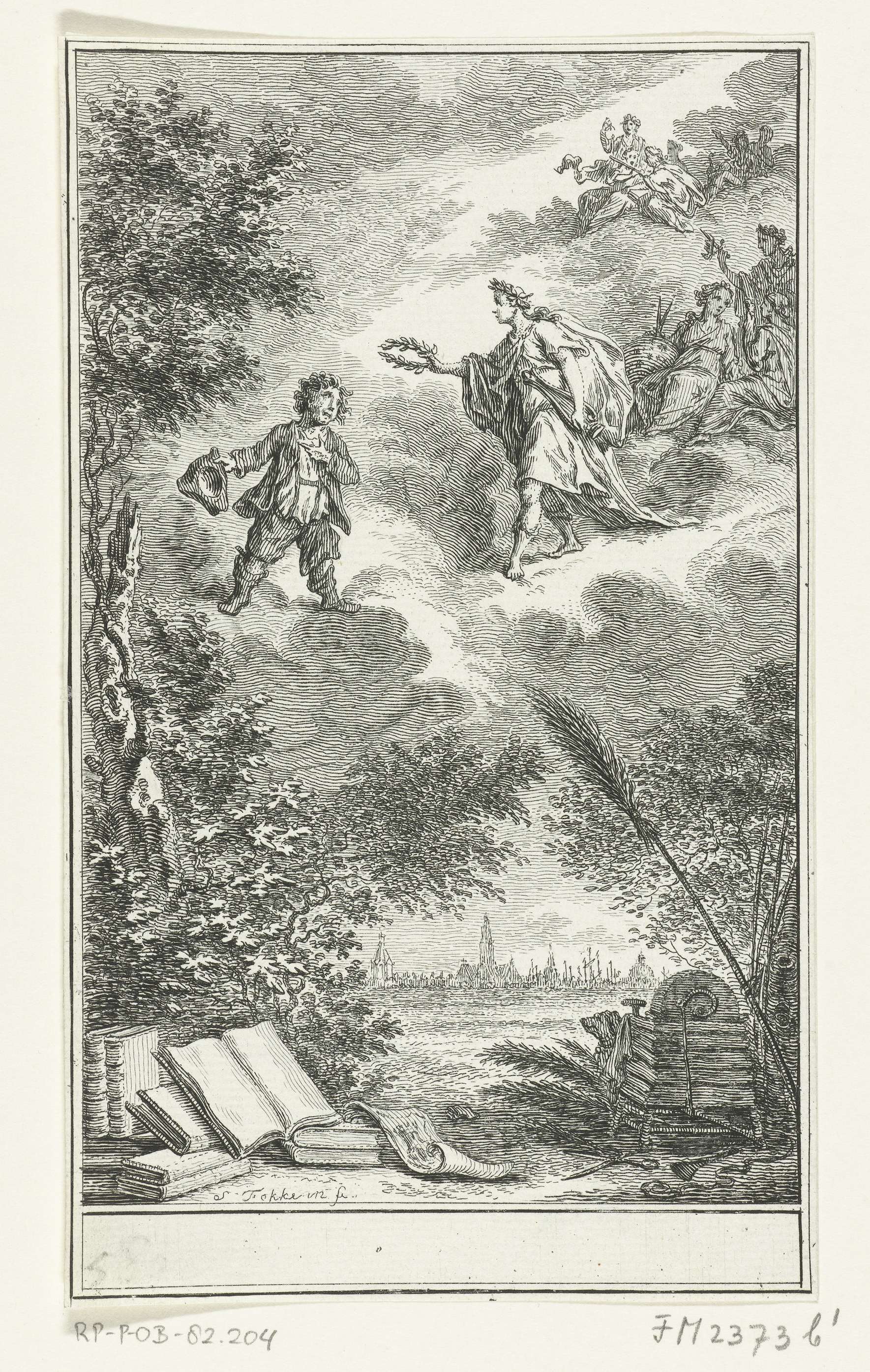 De dichter, schoorsteenveger en scharenslijper Petrus Johannes Beronicius op de Parnassus gekroond door Apollo. Onderaan boeken en attributen van de schoorsteenveger en scharenslijper. Titelpagina voor een gedicht van Beronicius over de opstandige Zeeuwse boeren en het tumult te Middelburg rond burgemeester Filips van den Brande op 21 juli 1672.