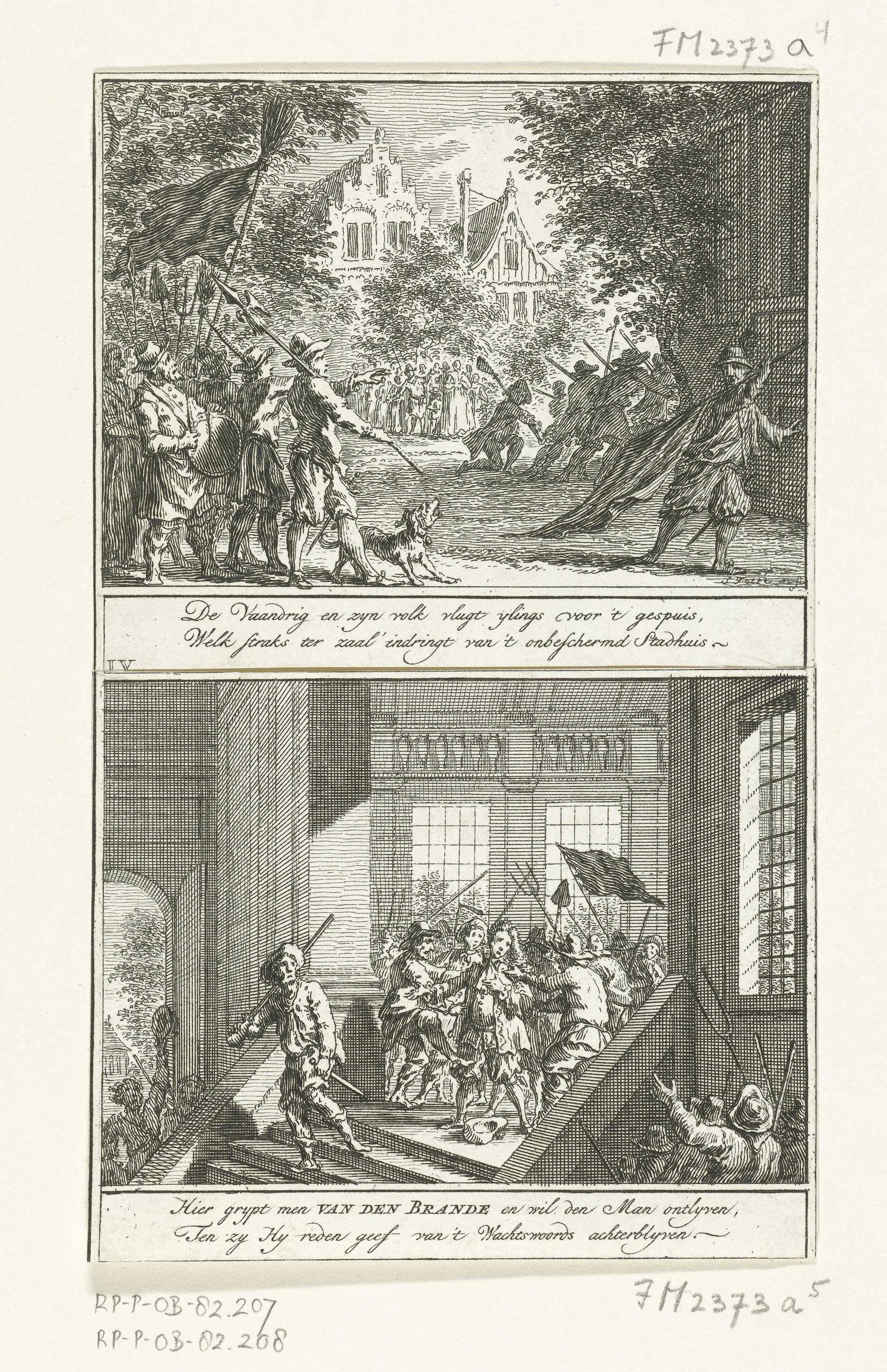 Vlucht van de vaandrig te Middelburg bij de komst van de opstandige boeren, 1672. Met onderschrift van twee regels. Illustratie nr. IV bij een gedicht van Petrus Johannes Beronicius over de opstandige Zeeuwse boeren en het tumult te Middelburg rond burgemeester Filips van den Brande op 21 juli 1672.