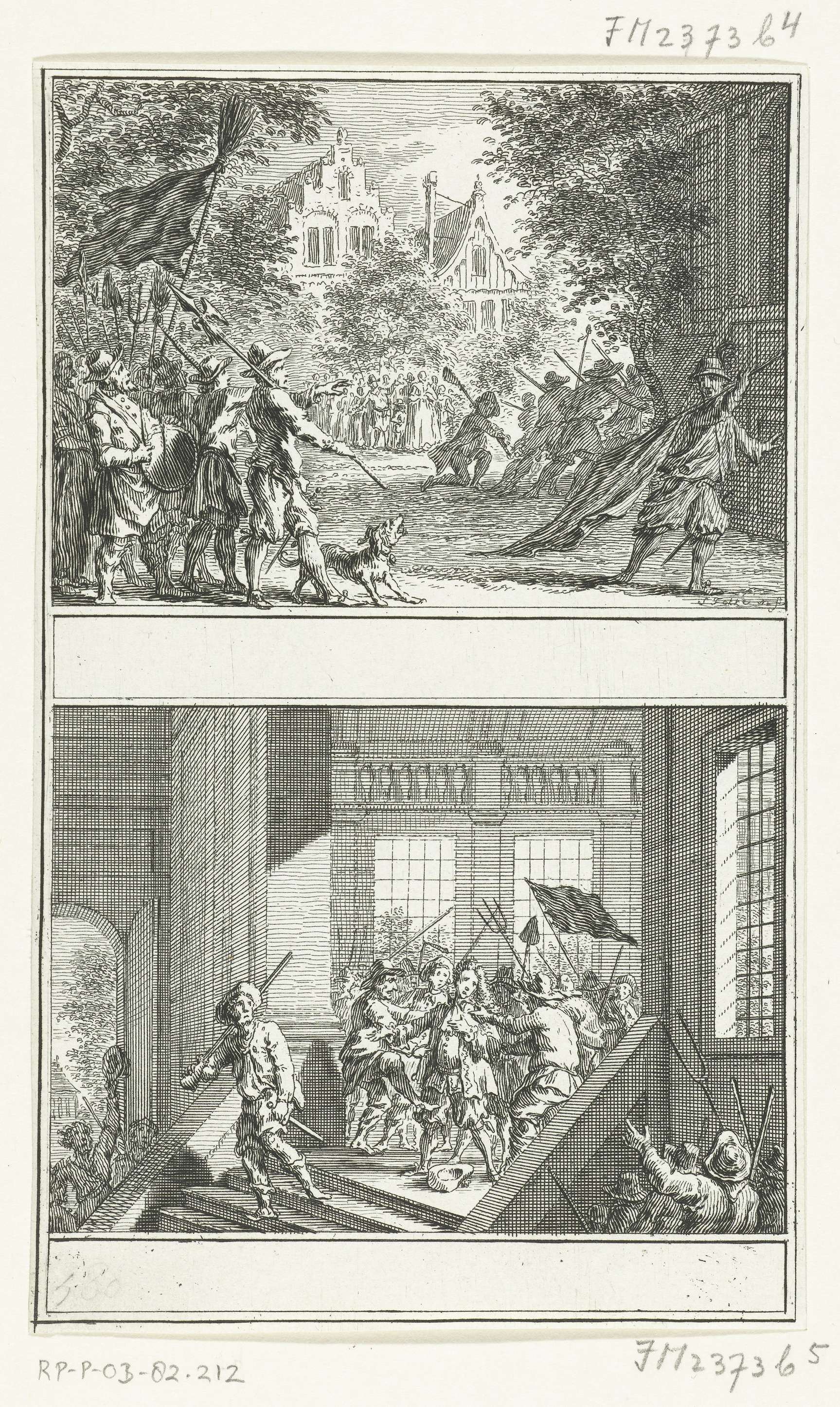 Blad met twee voorstellingen. Boven: de vlucht van de vaandrig te Middelburg bij de komst van de opstandige boeren. Onder: de mishandeling van burgemeester Van den Brande door de opstandige boeren, 1672. Illustraties nr. IV en V bij een gedicht van Petrus Johannes Beronicius over de opstandige Zeeuwse boeren en het tumult te Middelburg rond ...