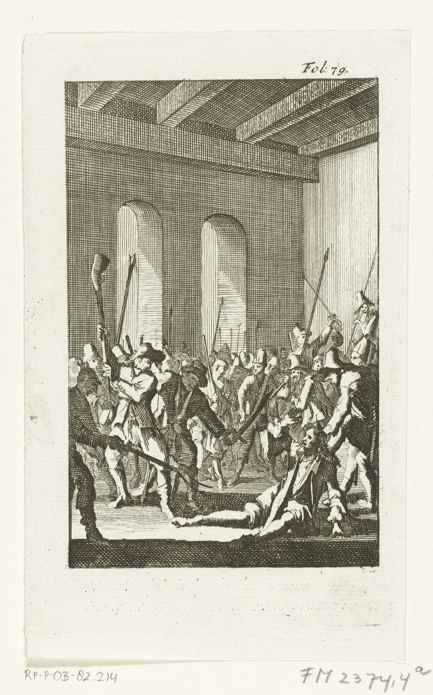 Burgemeester Filips van den Brande mishandeld door de opstandige boeren in het stadhuis, 1672. Illustratie bij het verhaal van Petrus Johannes Beronicius over de opstandige Zeeuwse boeren en het tumult te Middelburg rond burgemeester Filips van den Brande op 21 juli 1672.