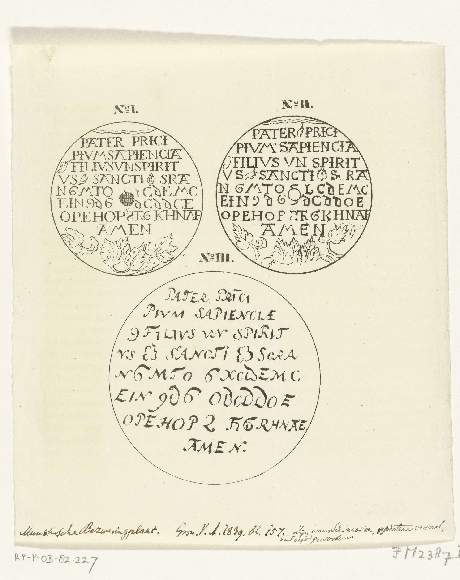 Drie (of twee) Munsterse bezweringsplaten (wellicht gezegende amuletten) met opschriften in het Latijn, in gebruik bij de bisschoppelijke troepen tijdens het beleg van Groningen door de bisschoppen van Keulen en Munster gedurende de maanden juli en augustus van het jaar 1672. Genummerd I-III.