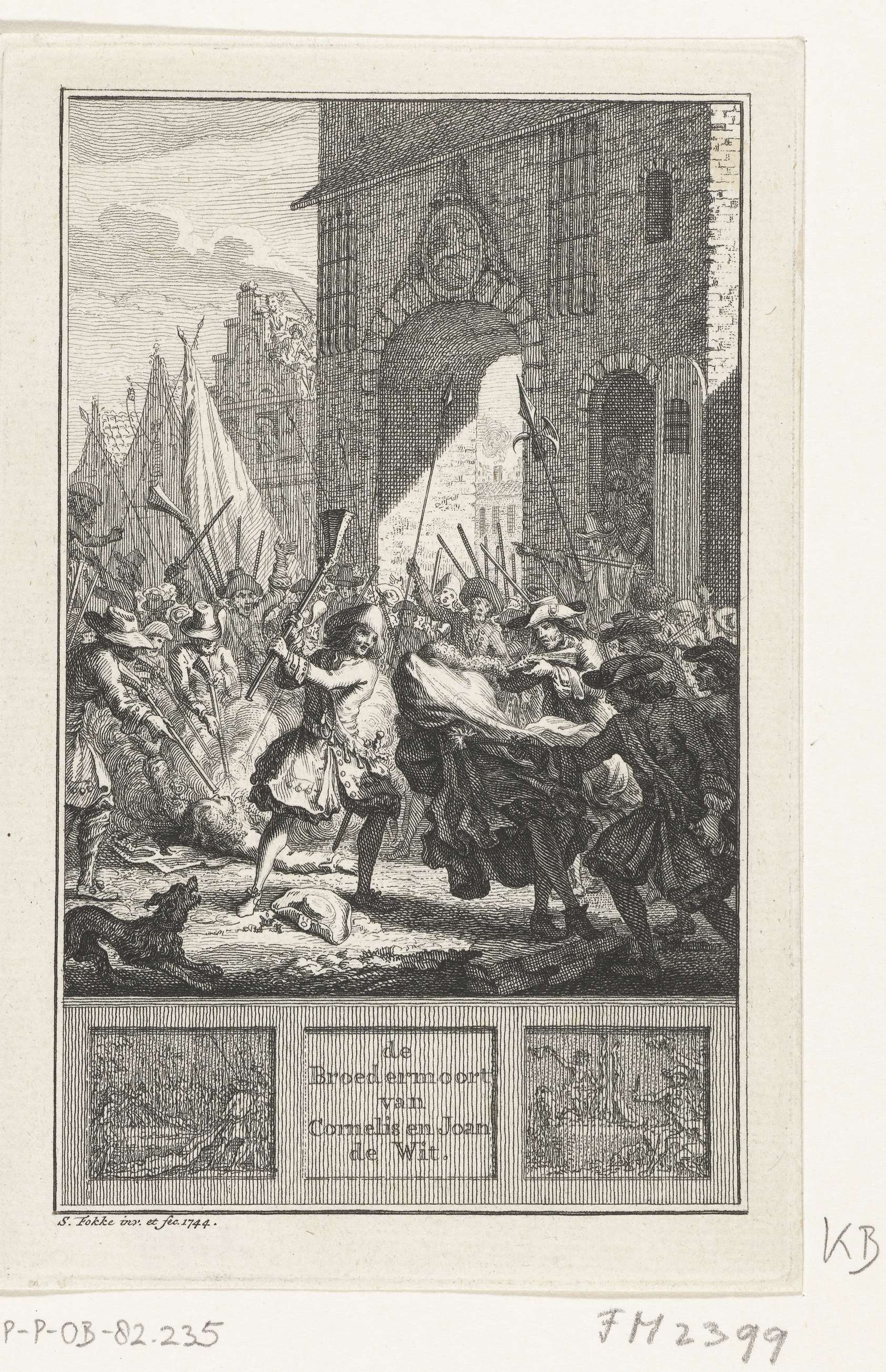 Johan en Cornelis de Witt worden uit de Gevangenpoort te Den Haag gehaald en op straat door de woedende menigte gedood, 20 augustus 1672. Onderaan twee kleine scènes van het wegslepen en verminken van de lichamen.