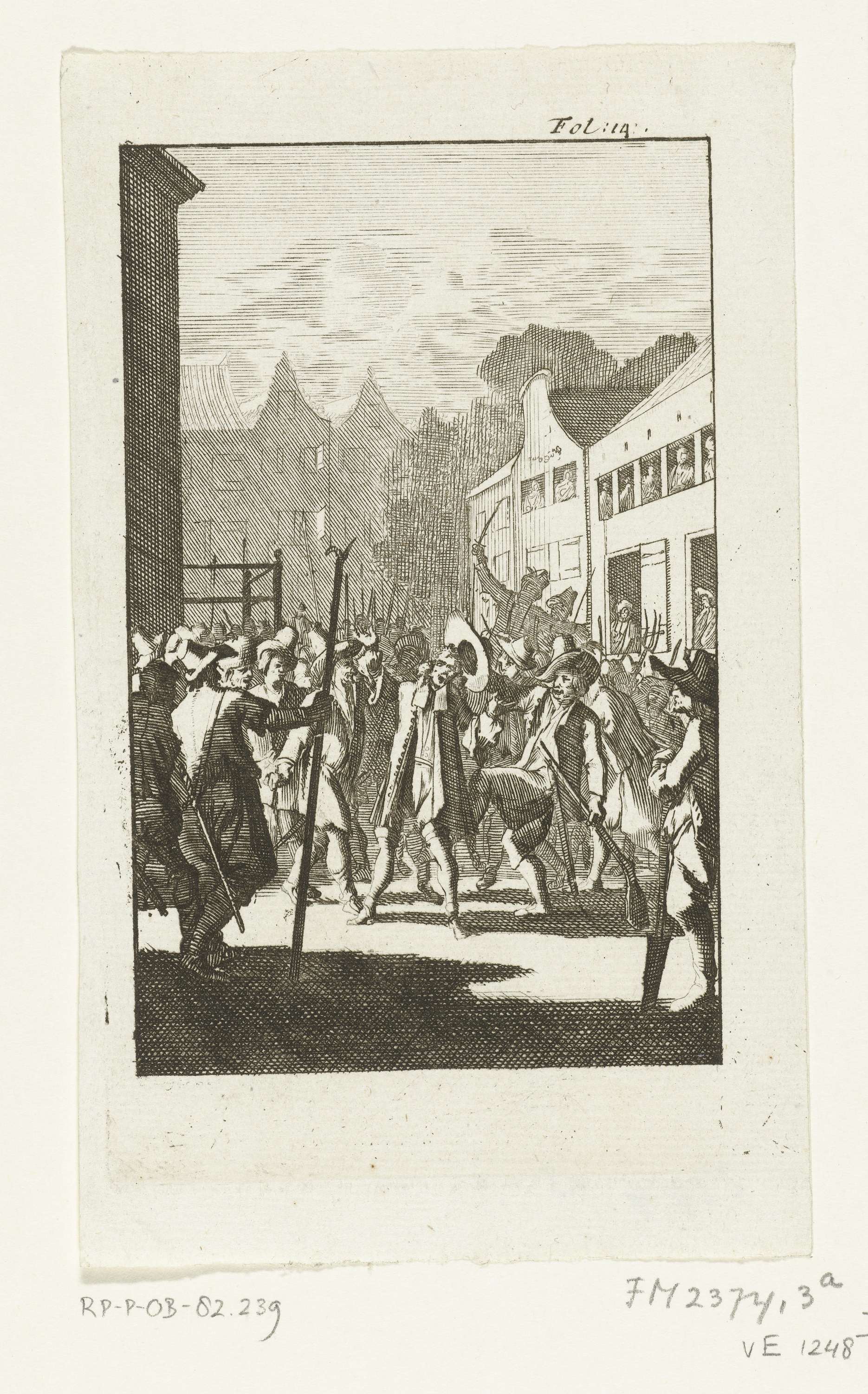 Nicolaas Reigersberge op straat aangevallen door de opstandige boeren, 1672. Illustratie bij het verhaal van Petrus Johannes Beronicius over de opstandige Zeeuwse boeren en het tumult te Middelburg rond burgemeester Filips van den Brande op 21 juli 1672.