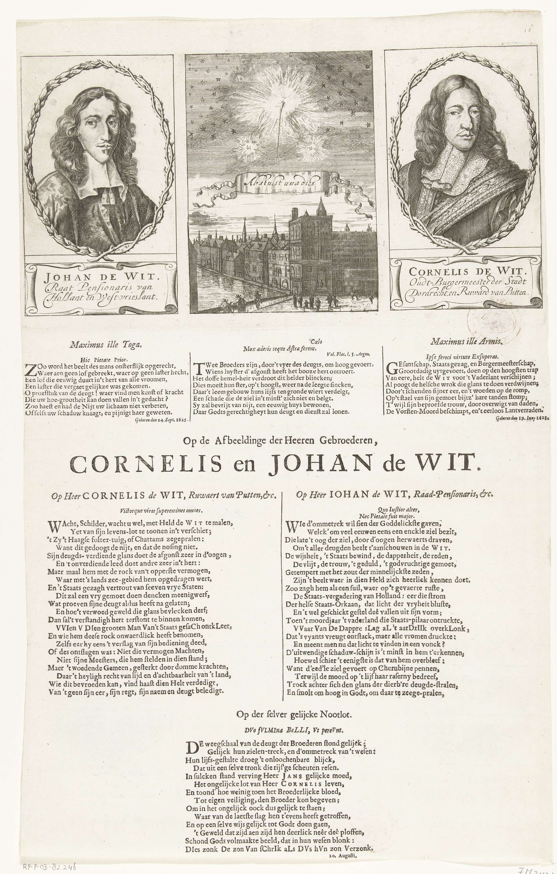 Blad over de gebroeders De Witt. Bovenaan de portretten van Johan en Cornelis de Witt aan weerszijden van een voorstelling van twee schitterende sterren die boven 's-Gravenhage aan de hemel verschenen. Hieronder deze voorstellingen staan drie korte verzen. Deze prent is gedrukt van dezelfde plaat als FM 2420a, maar alleen het portret van Johan de ...