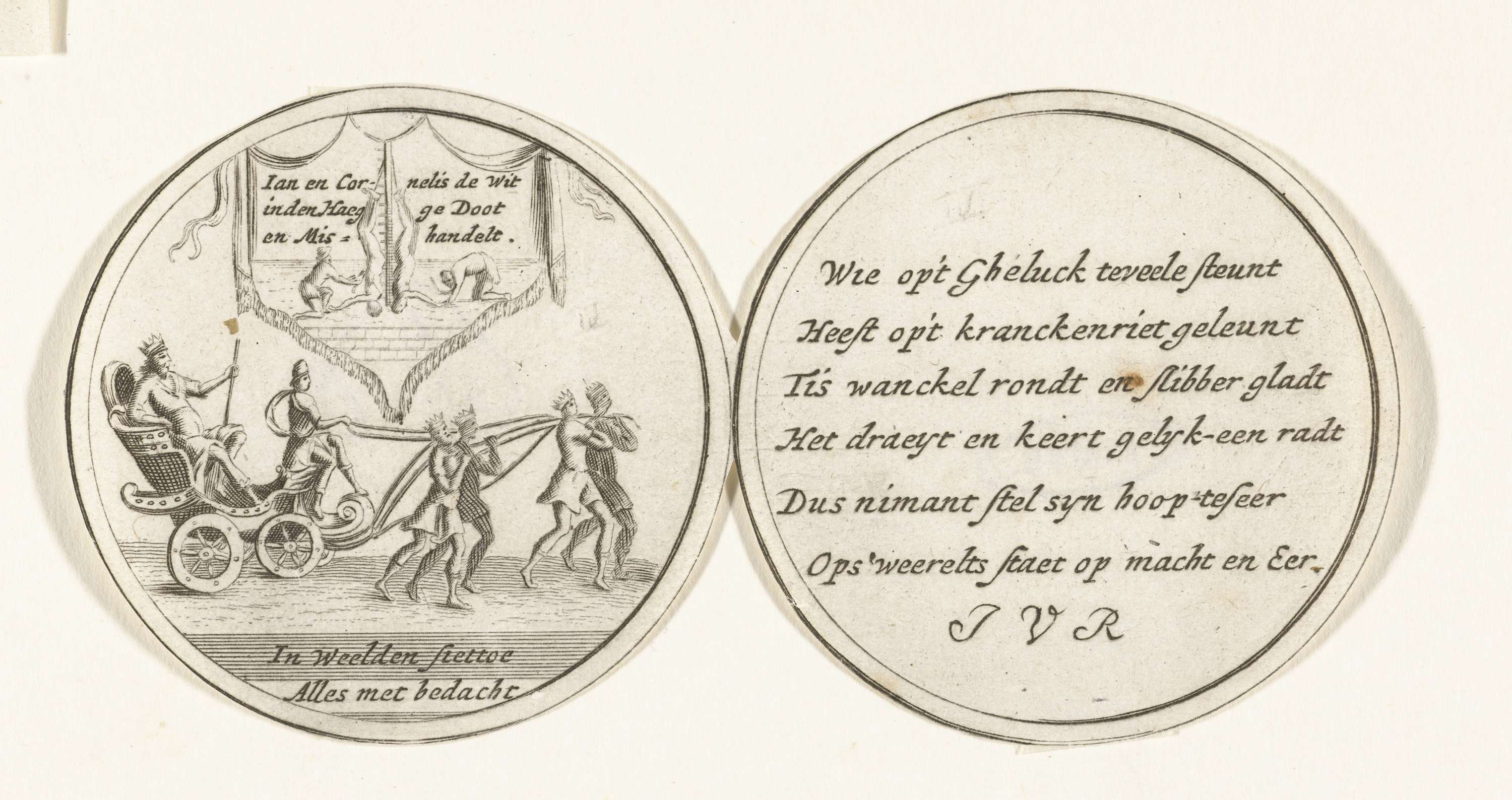 Voor- en keerzijde van een penning ter ere van de gebroeders Johan en Cornelis de Witt, vermoord op 20 augustus 1672, uitgeknipt. Voorzijde: een vorst in zijn triomfwagen getrokken door koningen met erboven een scène van de verminking van de lichamen. Keerzijde: een vers van zes regels gesigneerd J.V.R.