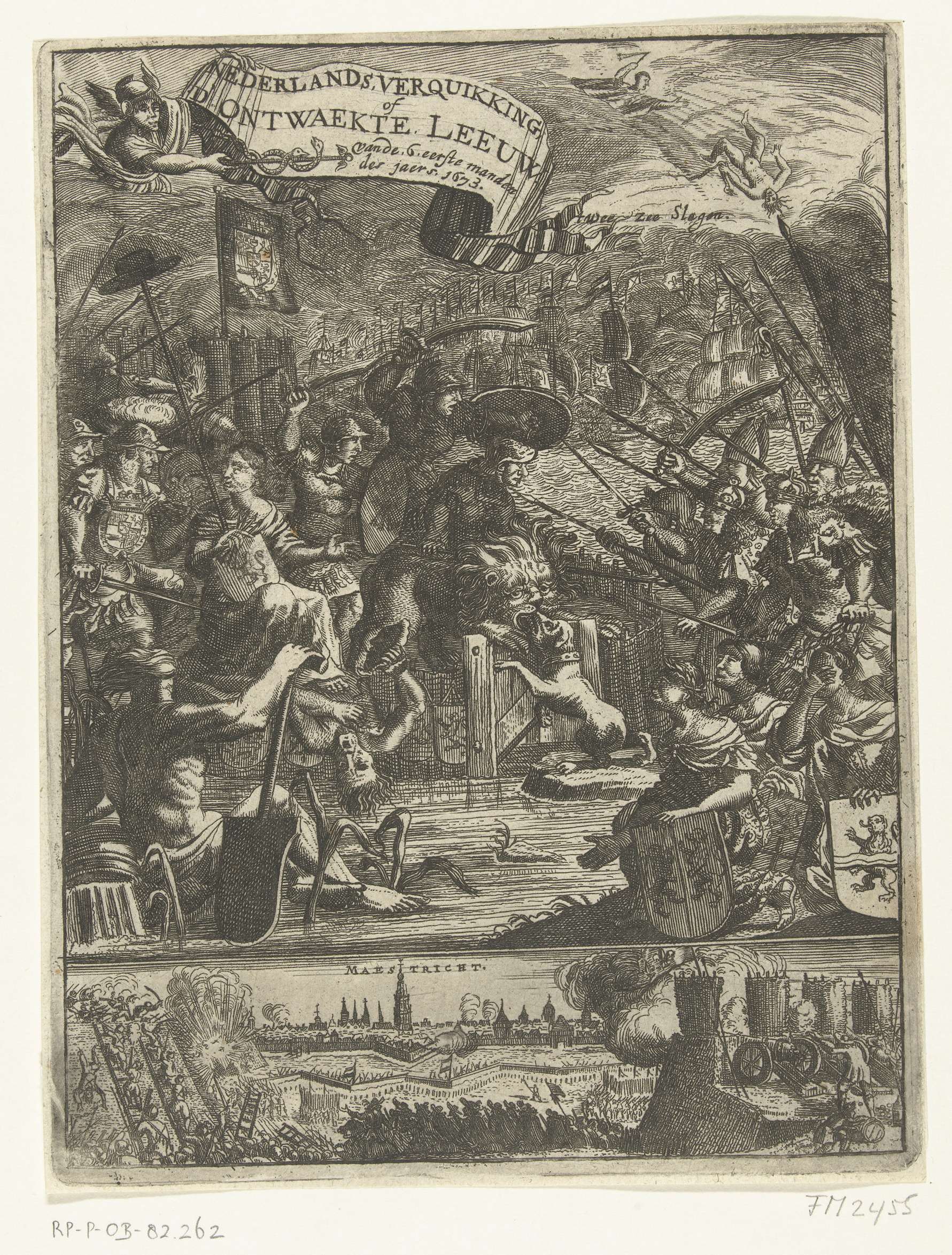 Titelpagina voor: Nederlands verquikking, of d'ontwaekte leeuw, 1673. Allegorische voorstelling over de positie van de Republiek tijdens het eerste halfjaar van 1673. De Hollandse Tuin aan alle kanten aangevallen door de Engelsen, Munstersen en de Franse koning Lodewijk XIV. De Franse koning houdt de provincies Gelderland, Overijssel en Utrecht gevangen aan kettingen. Links komt prins ...