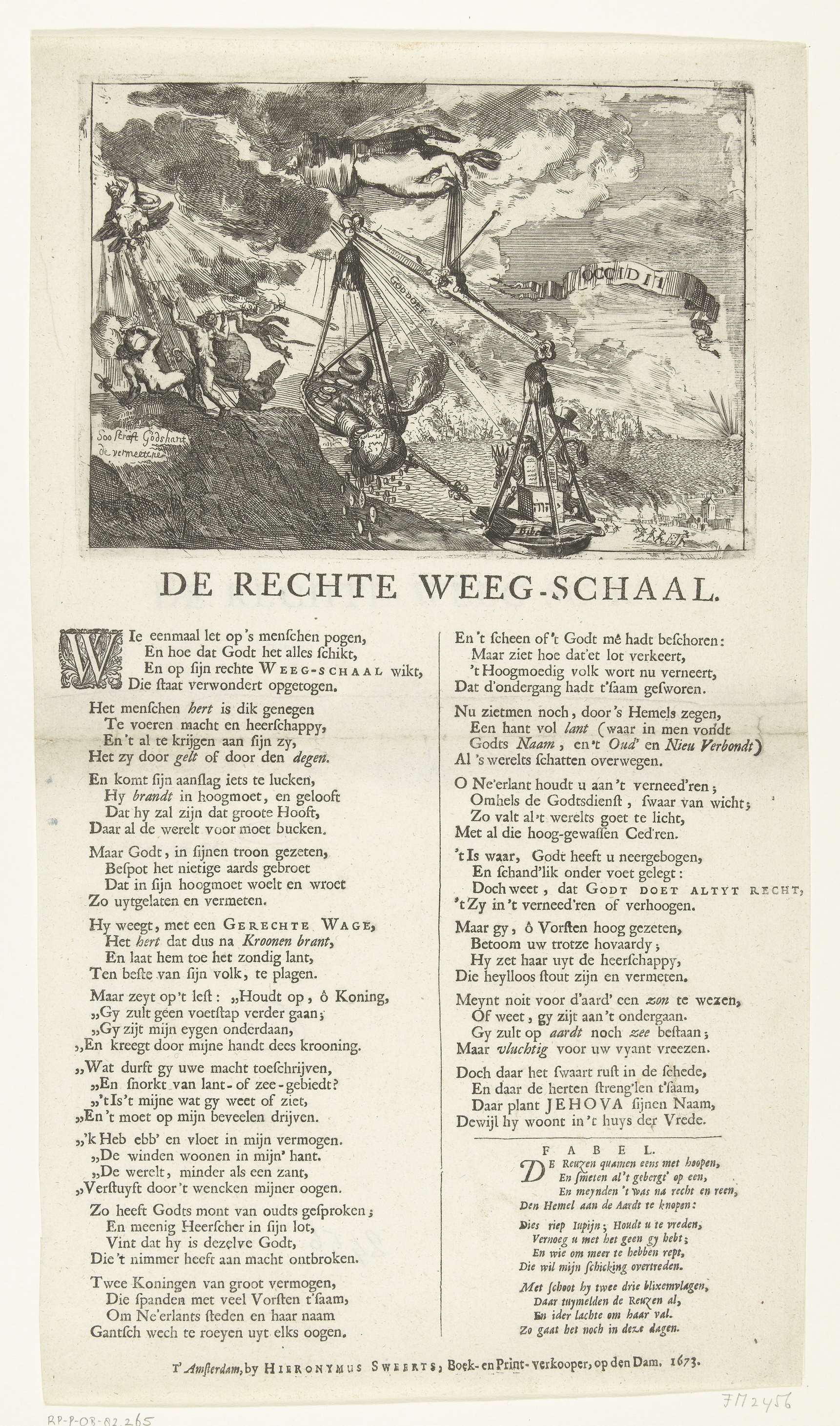 Allegorie op de politieke toestand in het jaar 1673. In een weegschaal in de hand van God worden de vrijheid van de Republiek met bijbel en wetstafelen gewogen tegen het geld en de wapens van de vijanden van de Republiek. Links worden personifacties van Frankrijk en de Duitse bisschoppen gestraft door Jupiter in de wolken. ...
