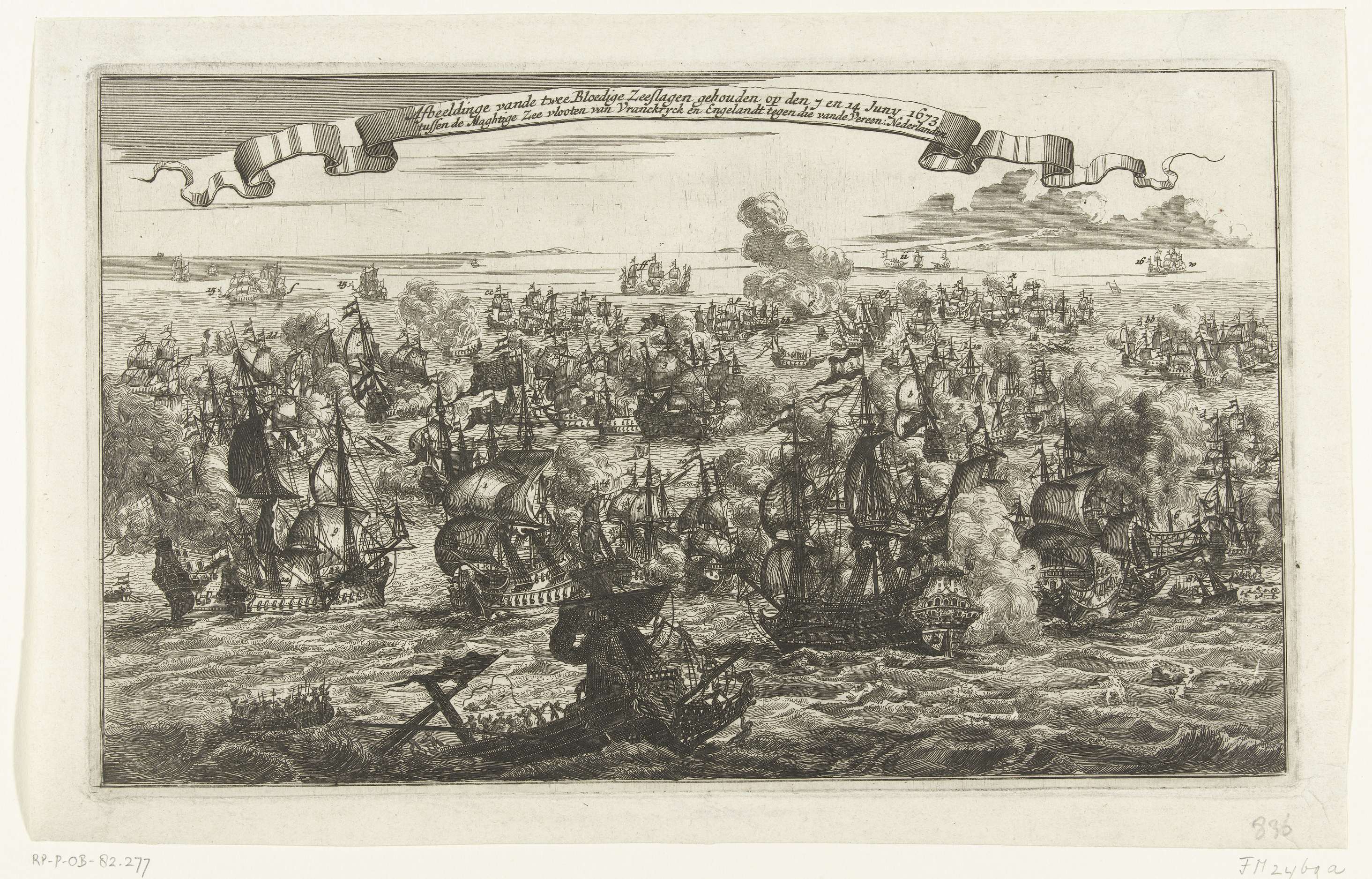 De zeeslagen voor de Zeeuwse kust op de vlakte van Schoonevelt op 7 en 14 juni 1673 tussen de vloot van de Republiek onder Michiel Adriaenszoon de Ruyter en de gecombineerde Engels-Franse vloot onder Prins Rupert en graaf Jean d'Estrées. Details in de voorstelling aangeduid met cijfers, maar zonder legenda.