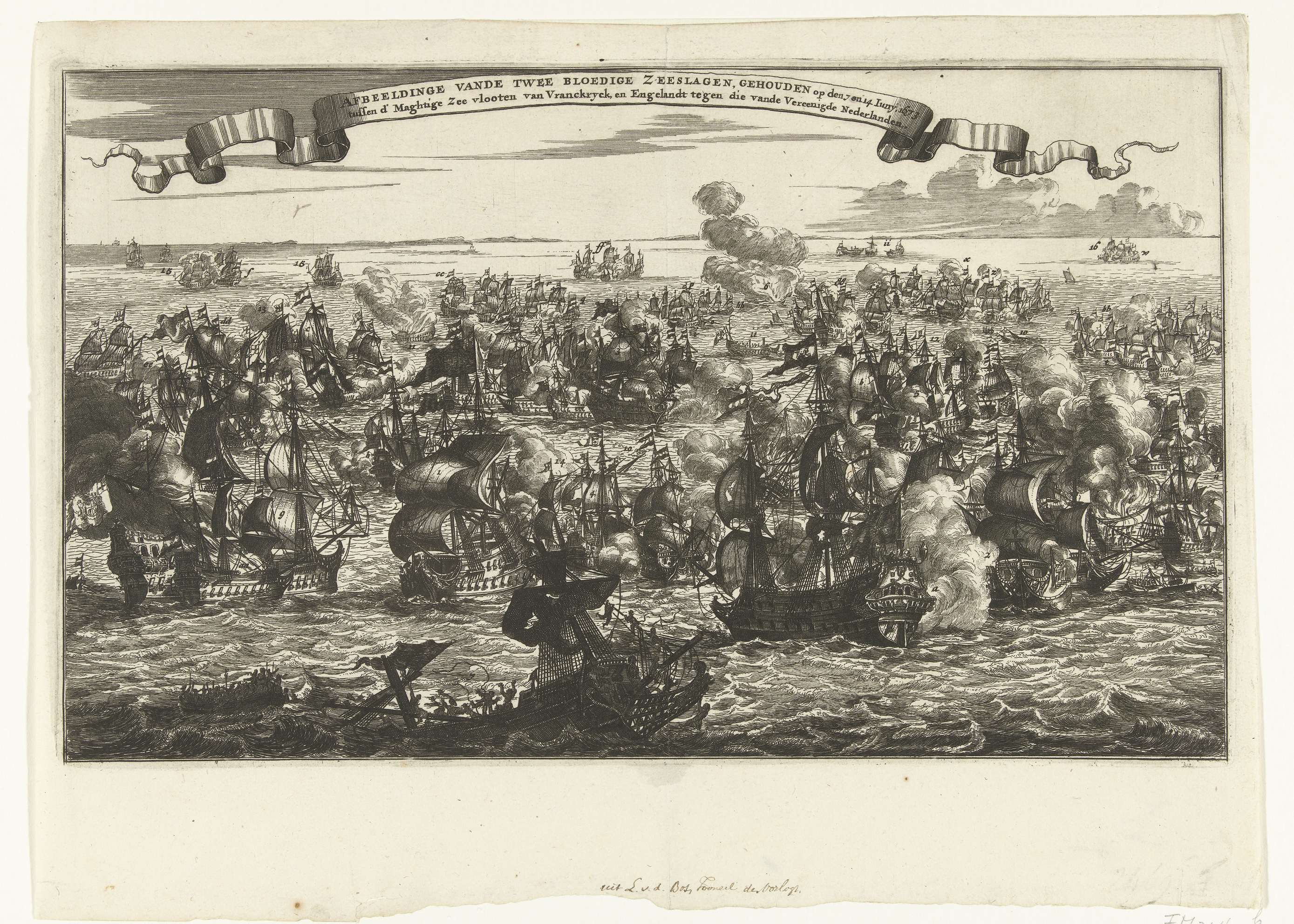 De zeeslagen voor de Zeeuwse kust op de vlakte van Schoonevelt op 7 en 14 juni 1673 tussen de vloot van de Republiek onder Michiel Adriaenszoon de Ruyter en de gecombineerde Engels-Franse vloot onder Prins Rupert en graaf Jean d'Estrées. Details in de voorstelling aangeduid met cijfers, maar zonder legenda.