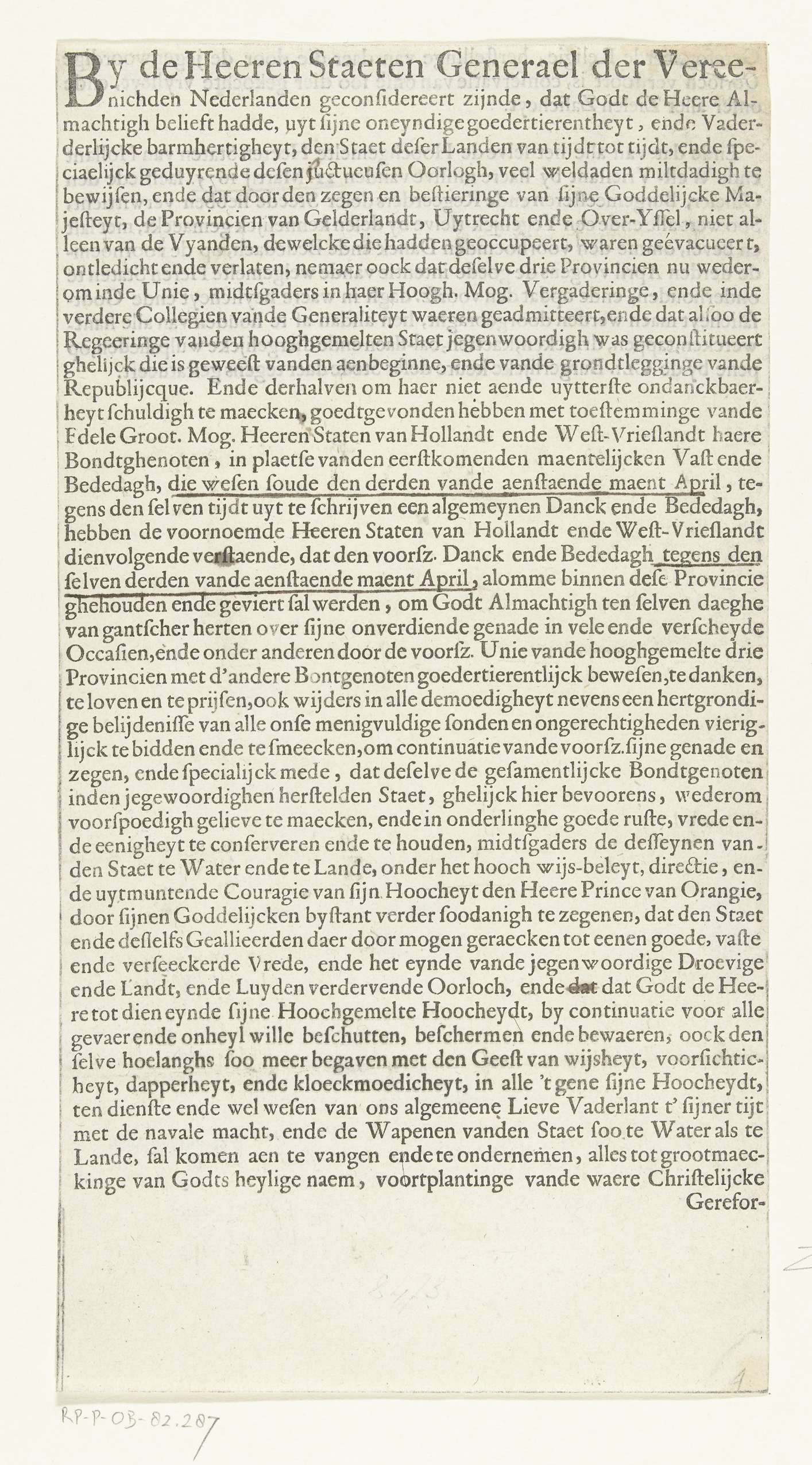 Uitschrijving door de Staten van Holland en West-Friesland van een algemene dank- en gebedsdag op 3 april 1675 wegens de terugkeer van de provincies Gelderland, Utrecht en Overijssel in de Unie. Tekst in één kolom op voor- en achterzijde van het blad.