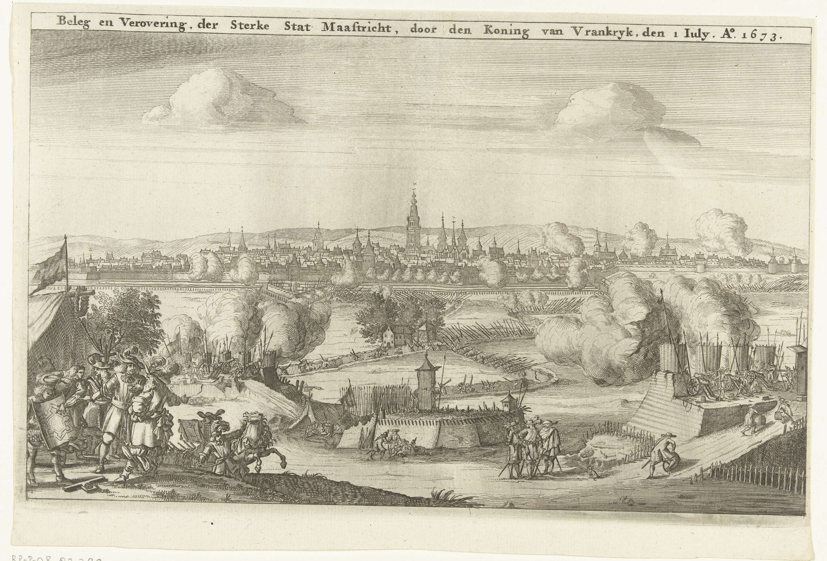 Beleg en verovering van Maastricht door de Franse legers op 30 juni 1673. Gezicht vanuit de posities van de belegerende troepen op de stad. Op de voorgrond links overleggen veldheren met ingenieurs met een plattegrond.