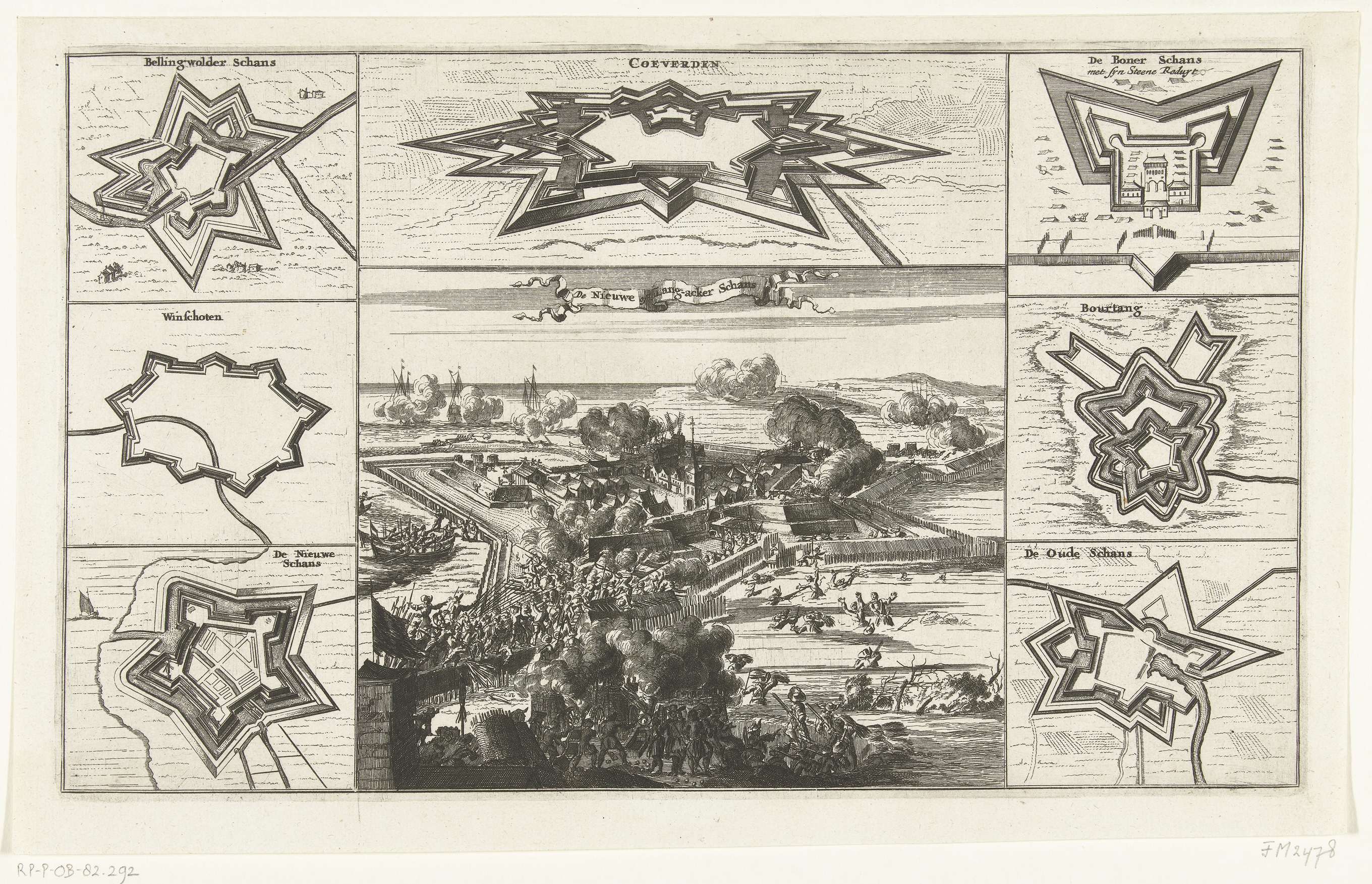 Verovering van Nieuweschans door de Staatse troepen onder Rabenhaupt op het Bisschoppelijke leger in de nacht van 21 op 22 juli 1673. Centrale scène met gevechten rond het fort omringd door 7 plattegronden van andere vestingen en schansen.