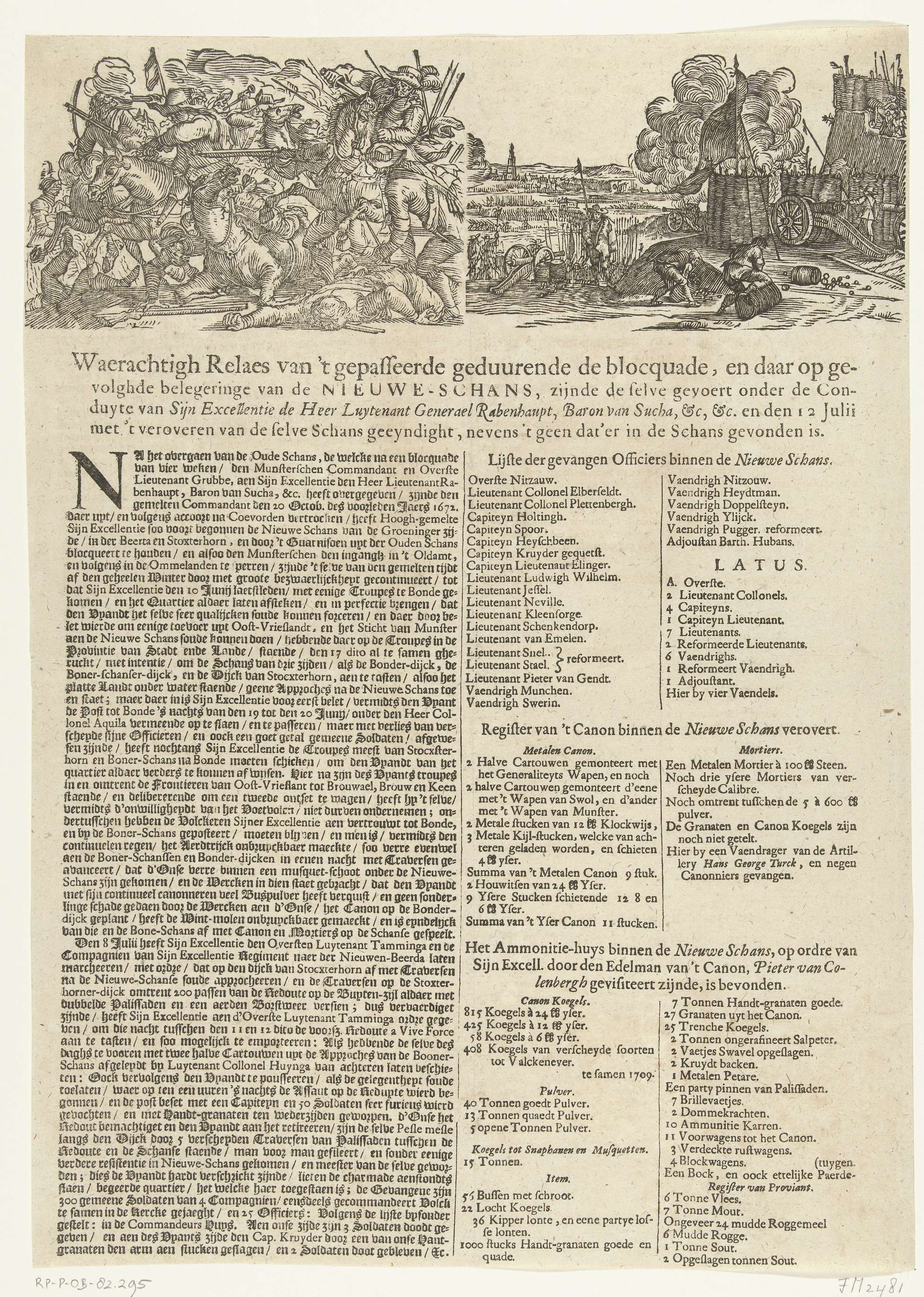 Verovering van Nieuweschans door de Staatse troepen onder Rabenhaupt op het Bisschoppelijke leger in de nacht van 21 op 22 juli 1673. Deze gebeurtenissen worden geïllustreerd met twee fragmenten van oude houtsneden met militaire voorstellingen. Hieronder een beschrijving van de inname, een lijst van officieren en de ammunitie aangetroffen in de vesting.