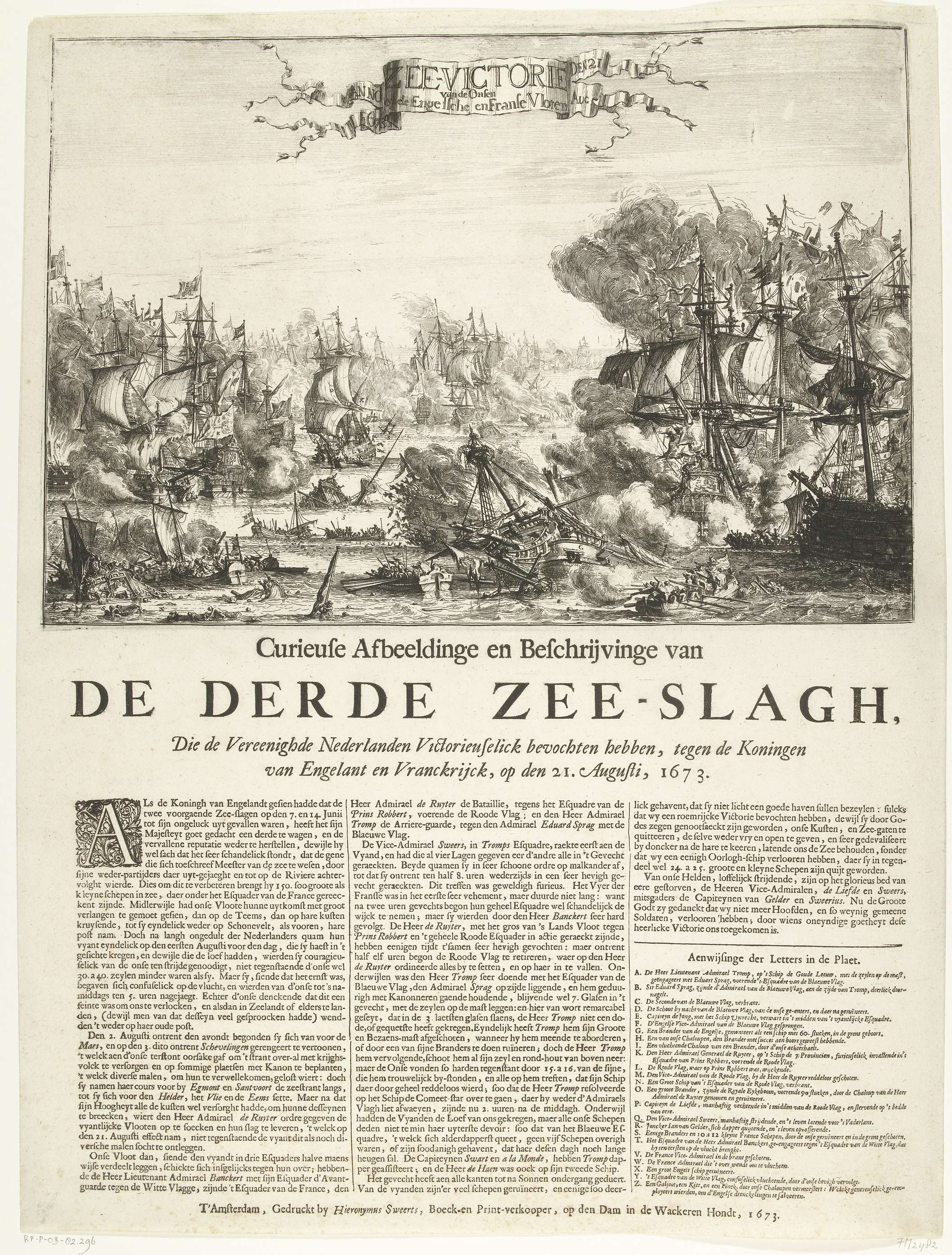 Zeeslag bij Kijkduin (bij Texel) op 21 augustus 1673 tussen de Staatse vloot onder Michiel Adriaenszoon de Ruyter en Cornelis Tromp en de Engels-Franse vloot onder prins Rupert en graaf Jean d'Estrées (II). Grote voorstelling van de zeeslag met brandende en zinkende schepen. Op het blad onder de plaat een beschrijving in 3 kolommen met ...