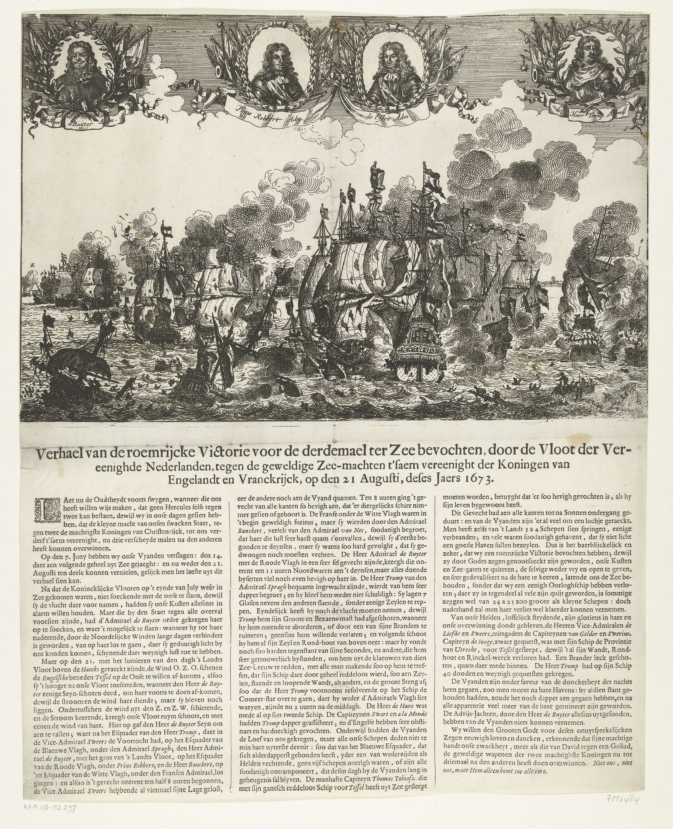Zeeslag bij Kijkduin, 21 augustus 1673. Zeeslag tussen de Staatse vloot onder Michiel Adriaenszoon de Ruyter en Cornelis Tromp en de gecombineerde Engels-Franse vloot onder prins Rupert en de graaf Jean d'Estrées (II). Bovenaan de portretten van De Ruyter, prins Rupert, d'Estrées en Tromp. Met cijfers en letters in de voorstelling maar zonder legenda. Vastgeplakt ...