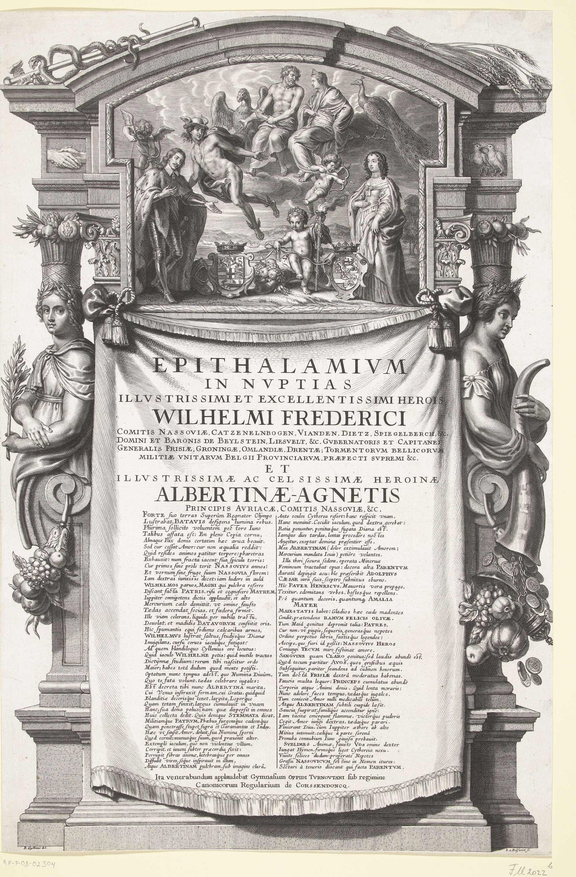 Allegorie op het huwelijk van Willem Frederik, graaf van Nassau-Dietz met Albertine Agnes, prinses van Oranje-Nassau, dochter van Frederik Hendrik, mei 1652. Willem Frederik wordt door Mercurius naar zijn echtgenote geleid, in de wolken zitten Jupiter en Juno. Centraal Cupido met een brandende toorts en de wapens van beide partijen. Onderaan een doek met een ...