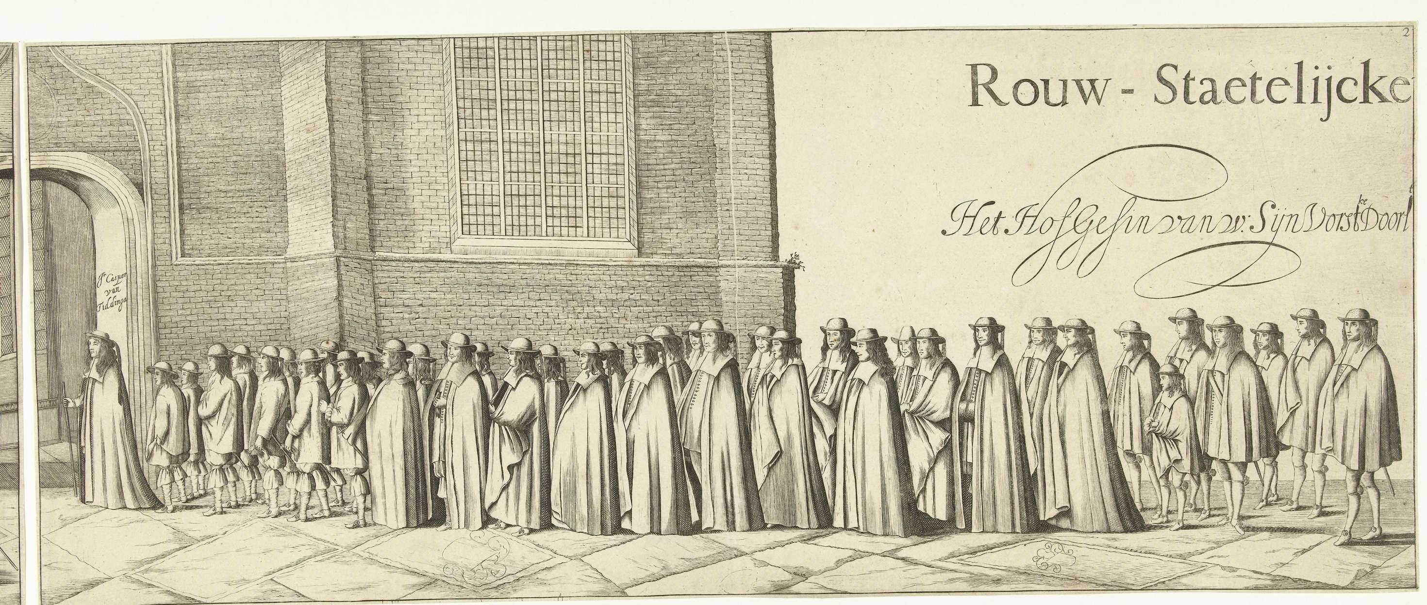 Begrafenisoptocht van Willem Frederik, graaf van Nassau-Dietz, in Leeuwarden op 6 januari 1665. Begin van de begrafenisstoet bij de ingang van de Jacobijnerkerk. Plaat nr. 2 in een ensemble van 24 (van de 25) ongemonteerde genummerde platen (zonder tekstbladen) die samen een lange fries vormen.