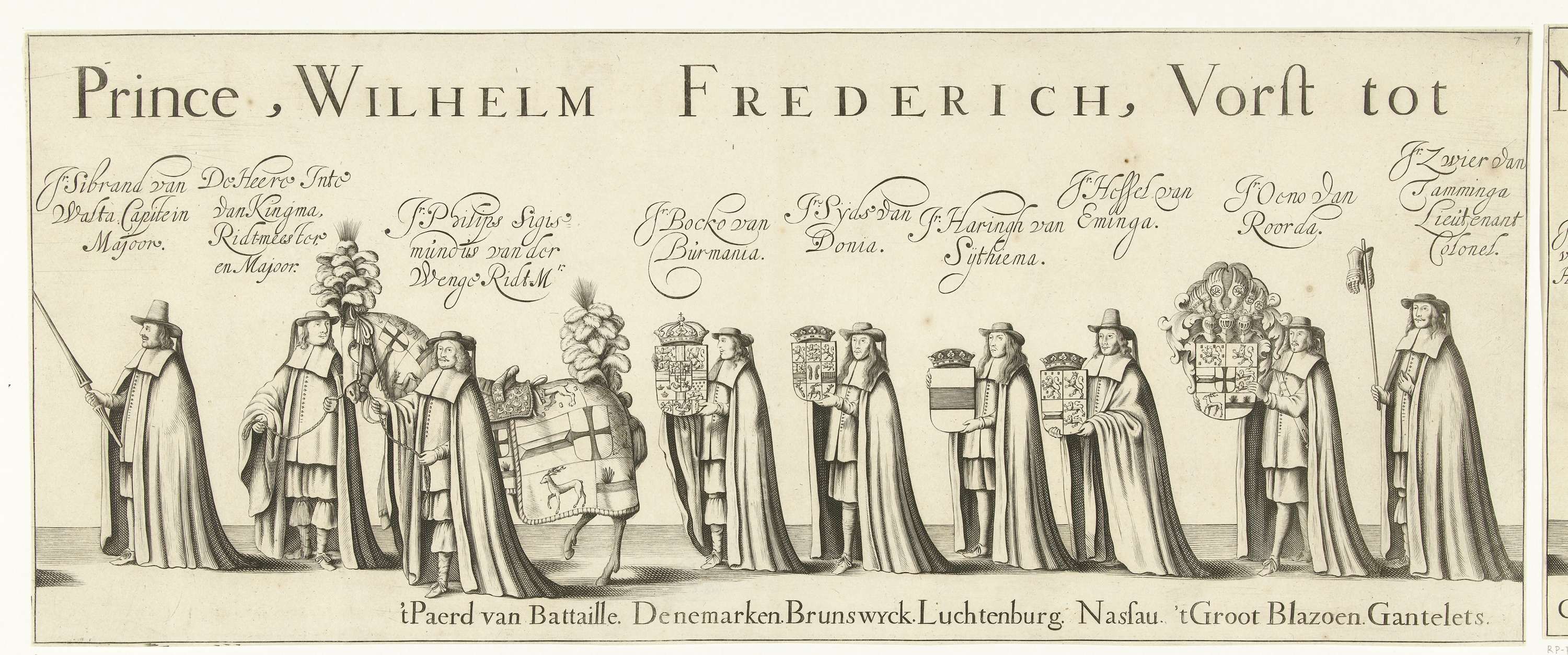 Begrafenisoptocht van Willem Frederik, graaf van Nassau-Dietz, in Leeuwarden op 6 januari 1665. Deel van de begrafenisstoet. Plaat nr. 7 in een ensemble van 24 (van de 25) ongemonteerde genummerde platen (zonder tekstbladen) die samen een lange fries vormen.