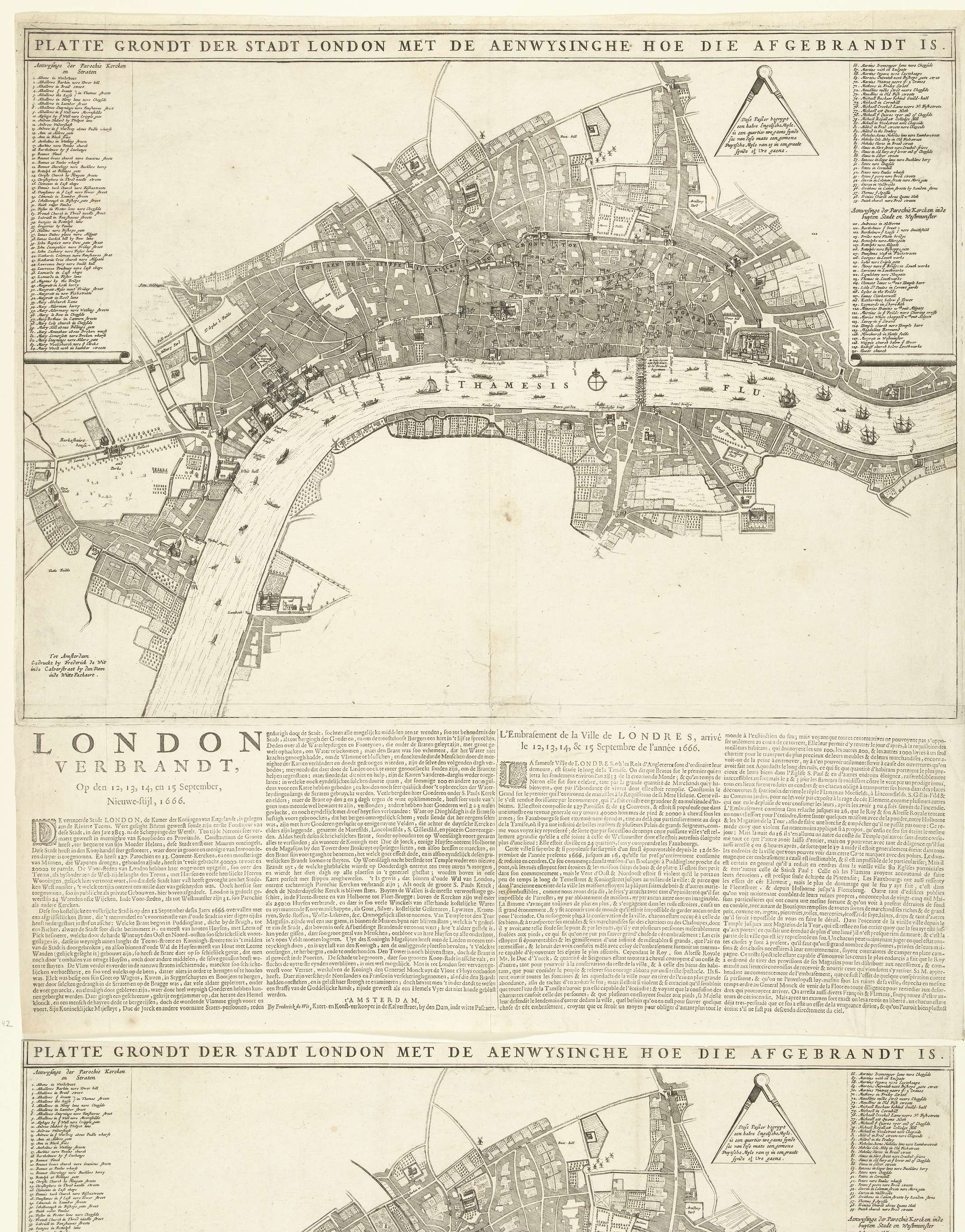 Plattegrond van Londen waarop is aangegeven het deel van de stad dat verwoest is tijdens de grote brand van 12-15 september 1666. Links en rechts de legenda 1-130, onder een tekstblad met 2 kolommen in het Nederlands en 2 kolommen in het Frans.