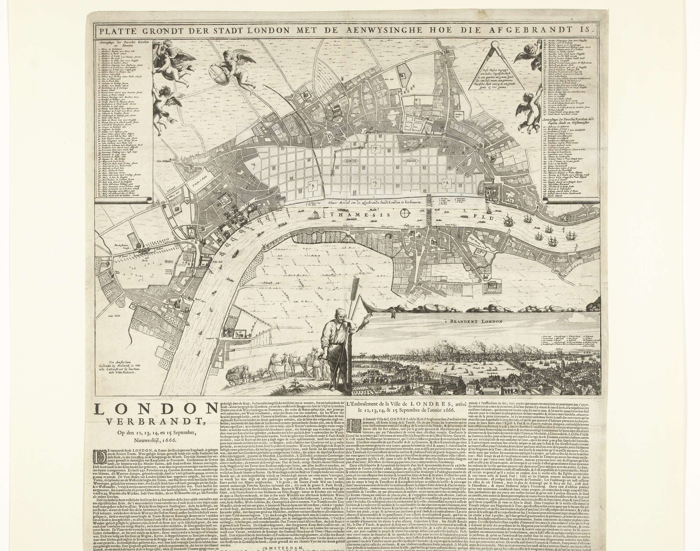 Plattegrond van Londen waarop is aangegeven het deel van de stad dat verwoest is tijdens de grote brand van 12-15 september 1666. Over het verwoeste deel van de stad is een losse flap geplakt met het plan voor de herbouw. Onderaan een inzet met een gezicht op de brandende stad, hierbij figuren van treurende boeren. ...