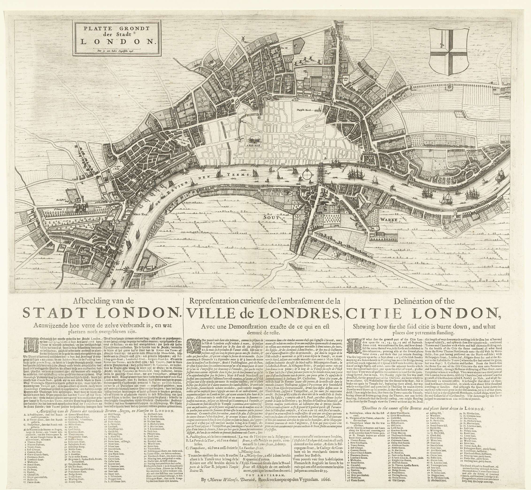 Plattegrond van Londen waarop is aangegeven het deel van de stad dat verwoest is tijdens de grote brand van 12-15 september 1666. Onderaan teksten in 2 kolommen in het Nederlands, 2 kolommen in het Frans en 2 kolommen in het Engels met een beschrijving van de gebeurtenissen en een lijst van de verbrande straten en ...