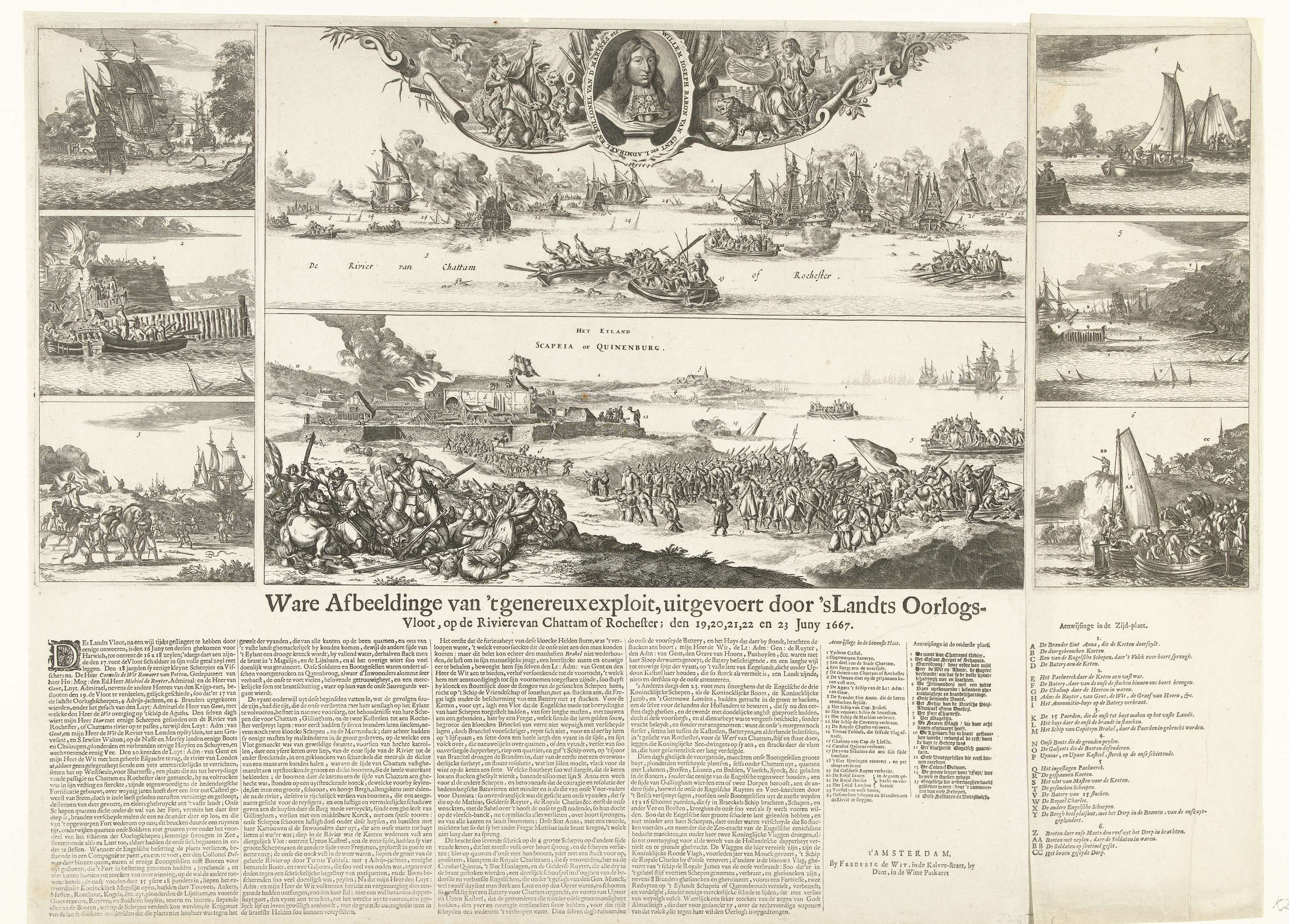 Blad met centraal twee voorstellingen en aan weerszijden zes kleine scènes 1-6 van de gebeurtenissen tijdens de Tocht naar Chatham. Bovenaan de vernietiging van de Engelse vloot op 20 juni 1667 door de Staatse vloot onder Michiel Adriaenszoon de Ruyter, met een portret van Willem Joseph Baron van Ghendt. Onder een voorstelling van de verovering ...