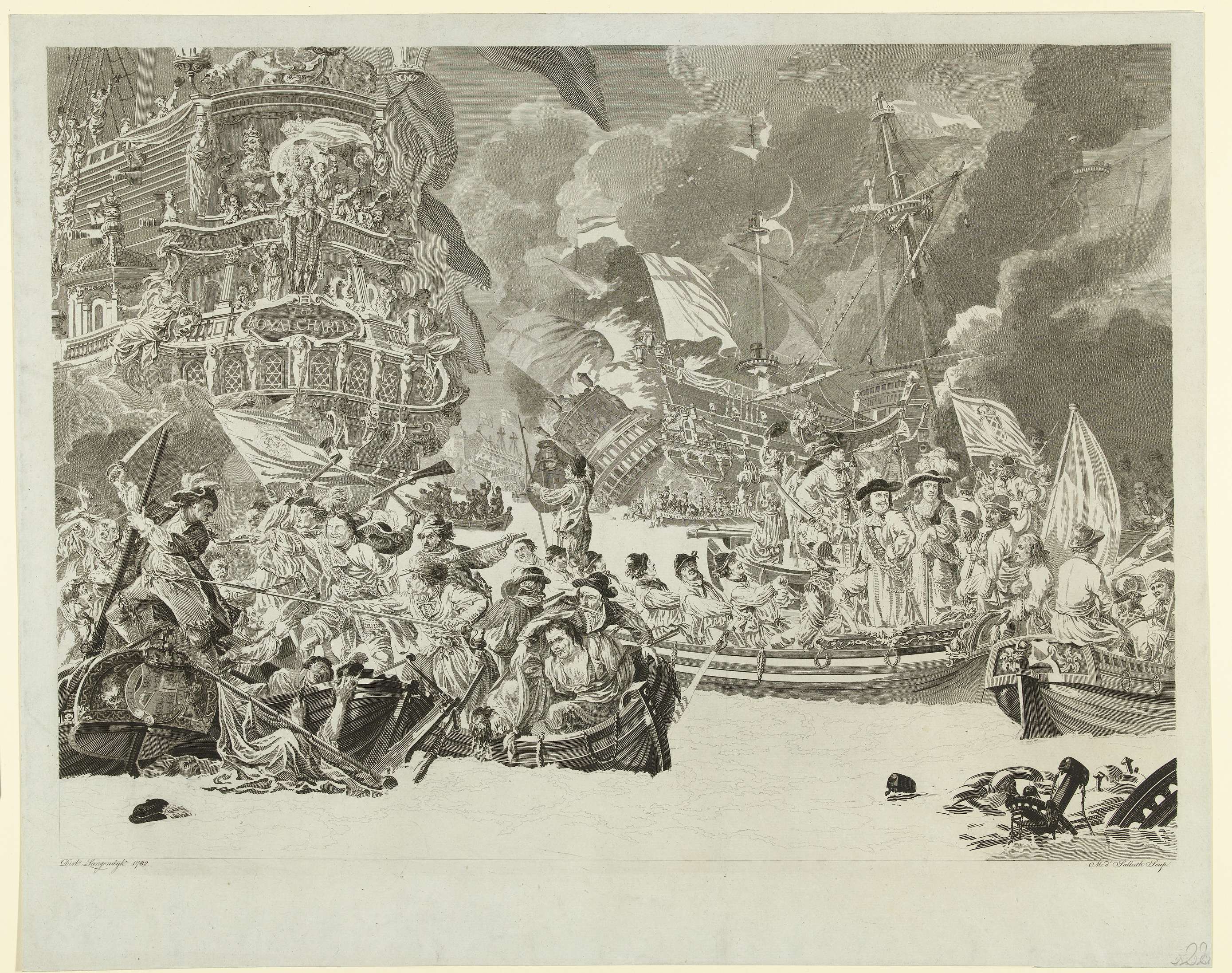 Van man tot man gevechten in sloepen, op de achtergrond de vernietiging van de Engelse vloot bij Chatham, links de verovering van het Engelse vlaggeschip de Royal Charles op 22 juni 1667. Centraal in een sloep staan Cornelis de Witt en Michiel Adriaenszoon de Ruyter, links kapitein Jan van Brakel schietend met zijn pistool. Op ...