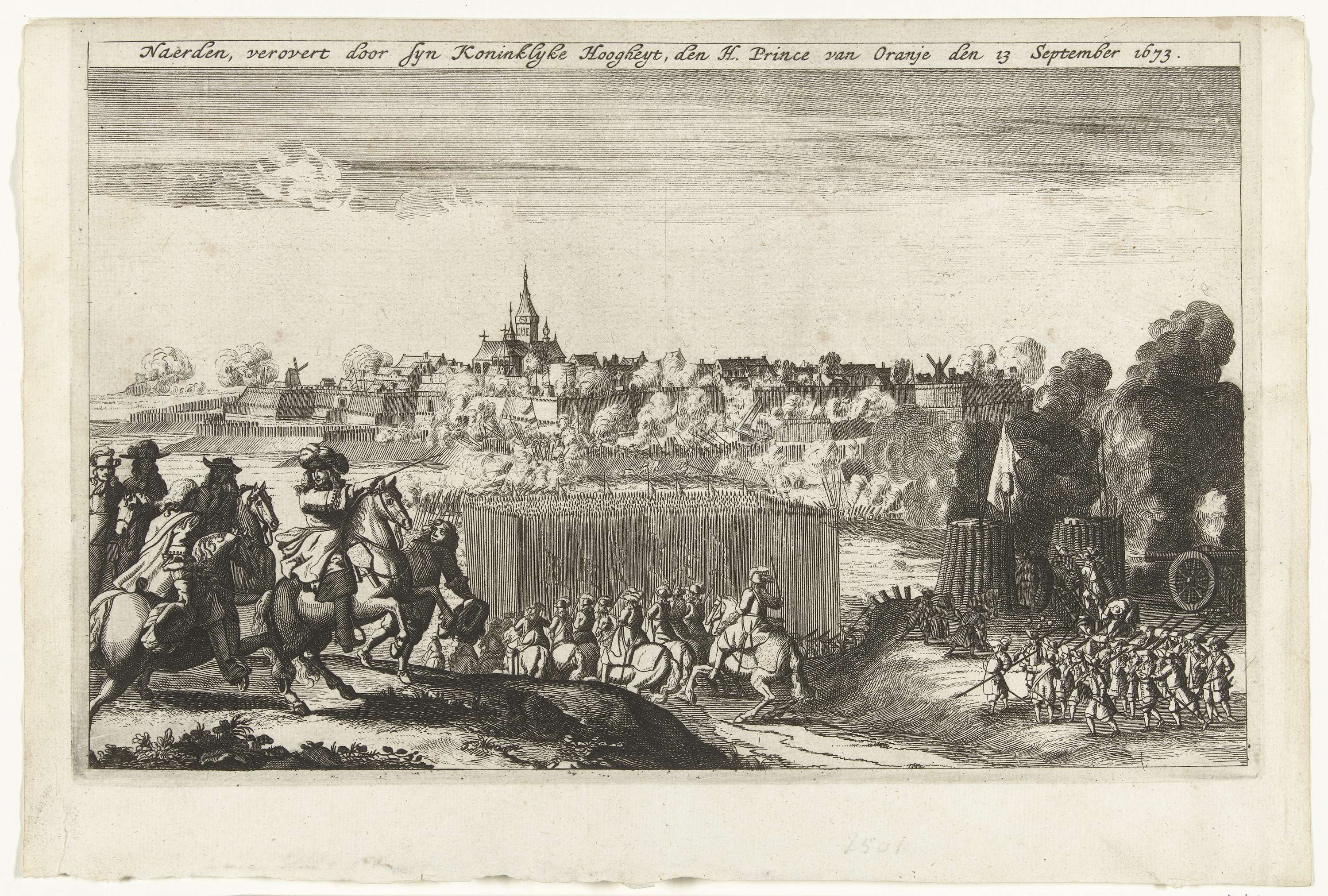 Belegering en verovering van Naarden door de Prins van Oranje, 12 september 1673. Op de prins te paard tussen zijn staf van officieren. In het midden de oprukkende legers en bestorming van de stad.