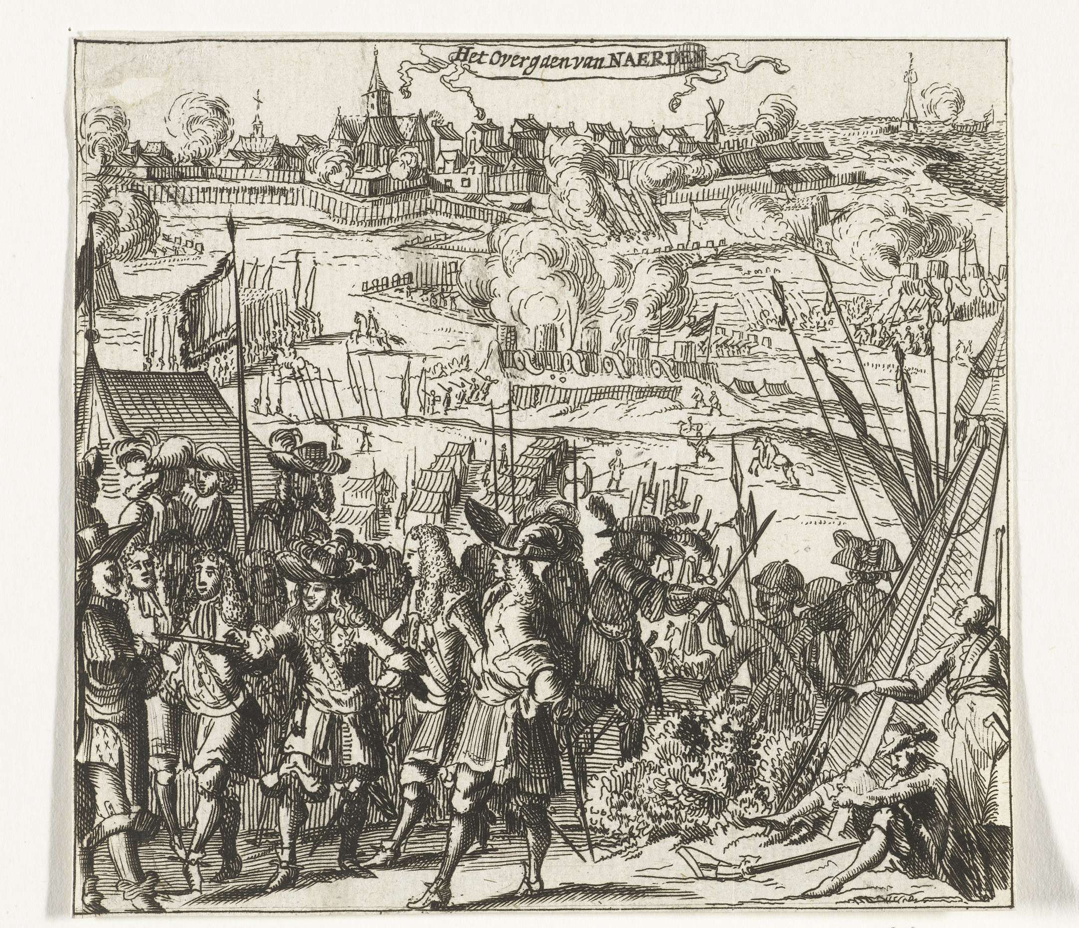Kleine voorstelling van de belegering en verovering van Naarden door de prins van Oranje, 12 september 1673. Op de voorgrond de prins tussen zijn staf van officieren. Op de achtergrond het beleg van de stad.