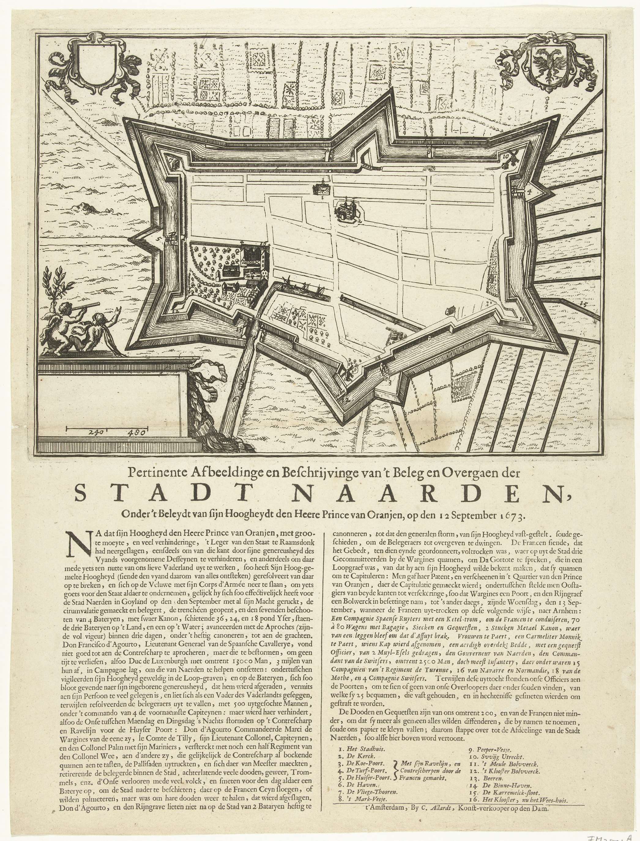 Plattegrond van de versterkingen om Naarden, door de prins Willem III belegerd en veroverd op 12 september 1673. Onder de plaat een beschrijving van de gebeurtenissen in 2 kolommen, met de legenda 1-16.