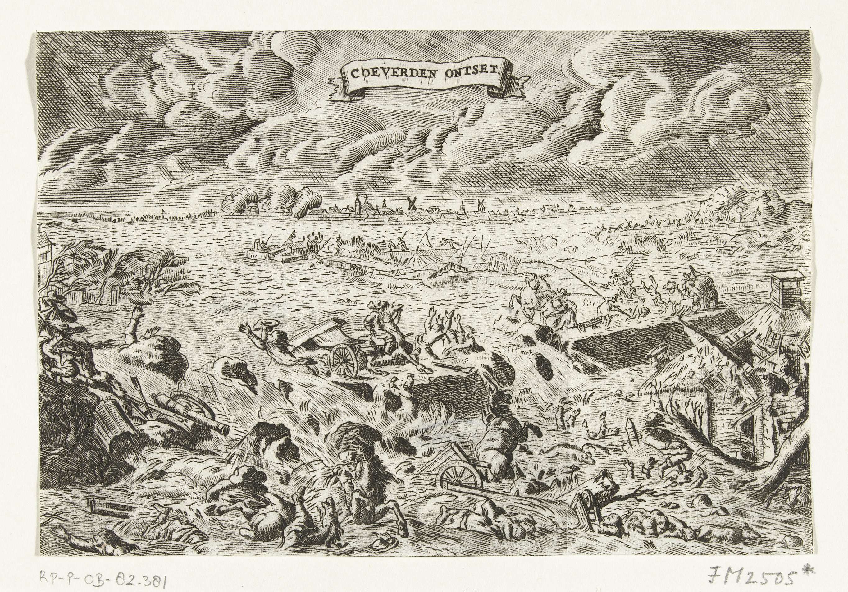Kleine prent van de dijkdoorbraak bij Coevorden, 1 oktober 1673. Vijandelijke ruiters en geschut worden door het water weggespoeld, in de verte de stad Coevorden.