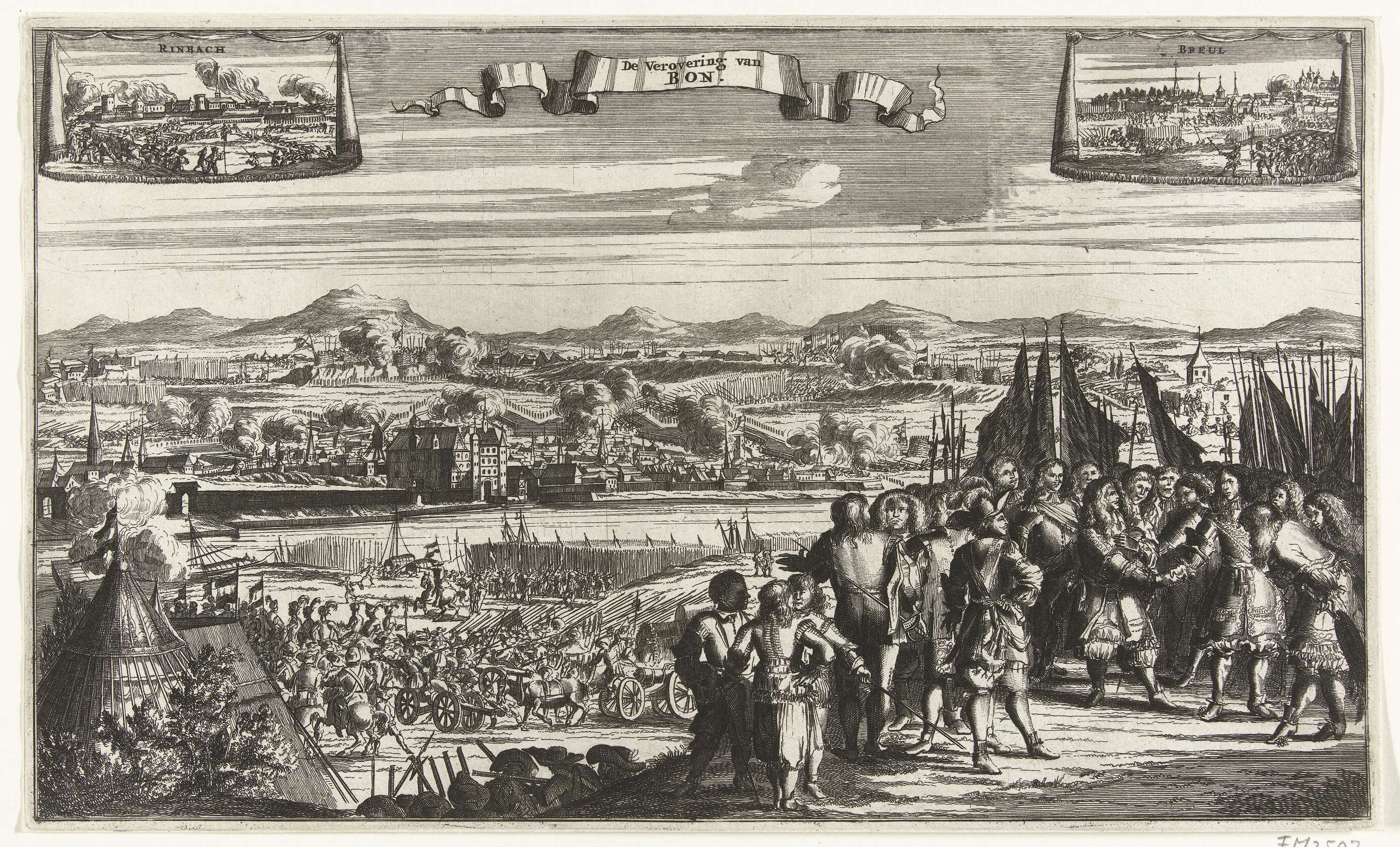 De verovering van Bonn door prins Willem III, 13 november 1673. Gezicht op de aan de Rijn gelegen Duitse stad. Op de voorgrond rechts feliciteren de prins en graaf Montecuccoli elkaar. Bovenaan in de hoeken twee kleine voorstellingen van de veroveringen van Rheinbach en Brühl.