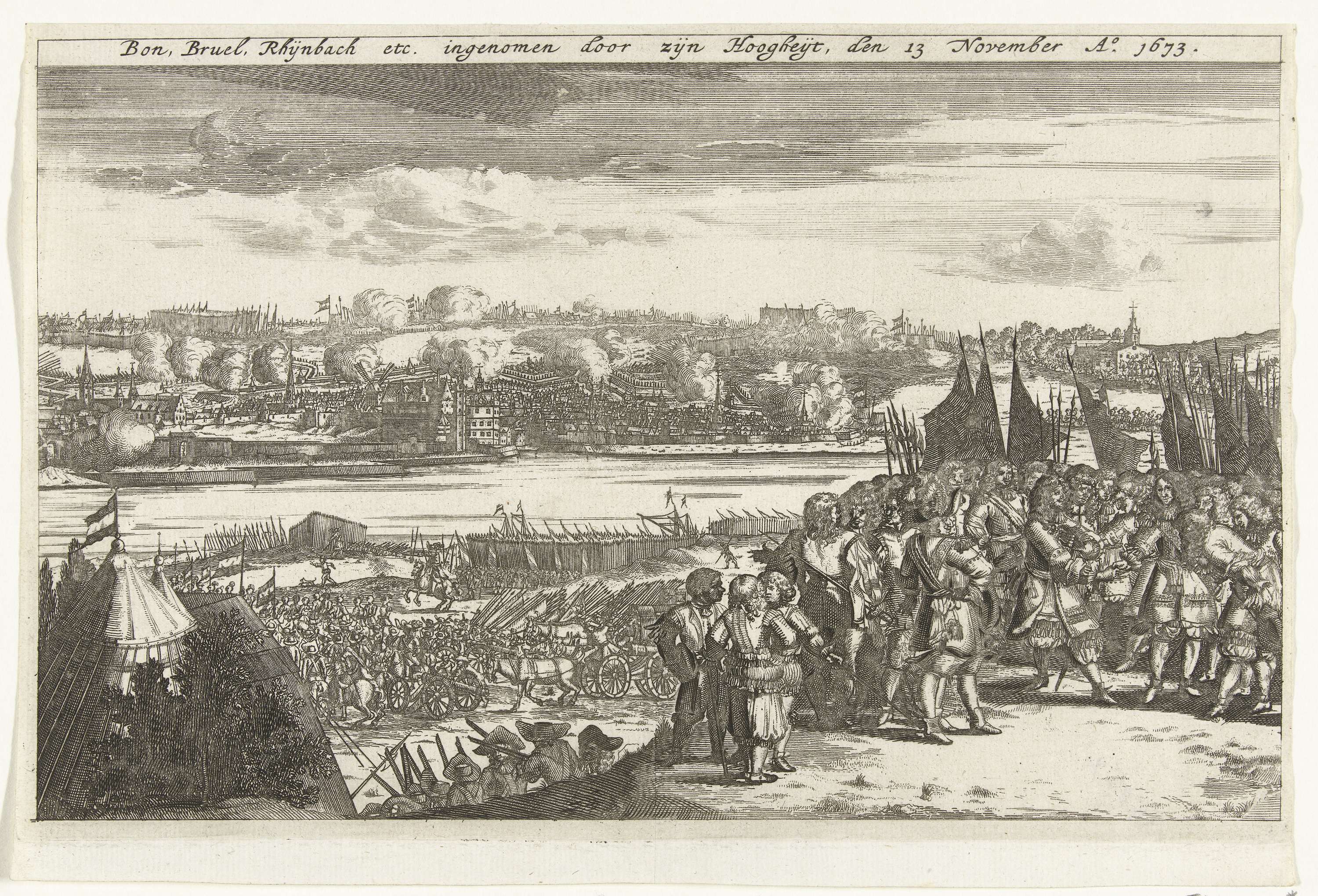 De verovering van Bonn door prins Willem III, 13 november 1673. Gezicht op de aan de Rijn gelegen Duitse stad. Op de voorgrond rechts feliciteren de prins en graaf Montecuccoli elkaar.