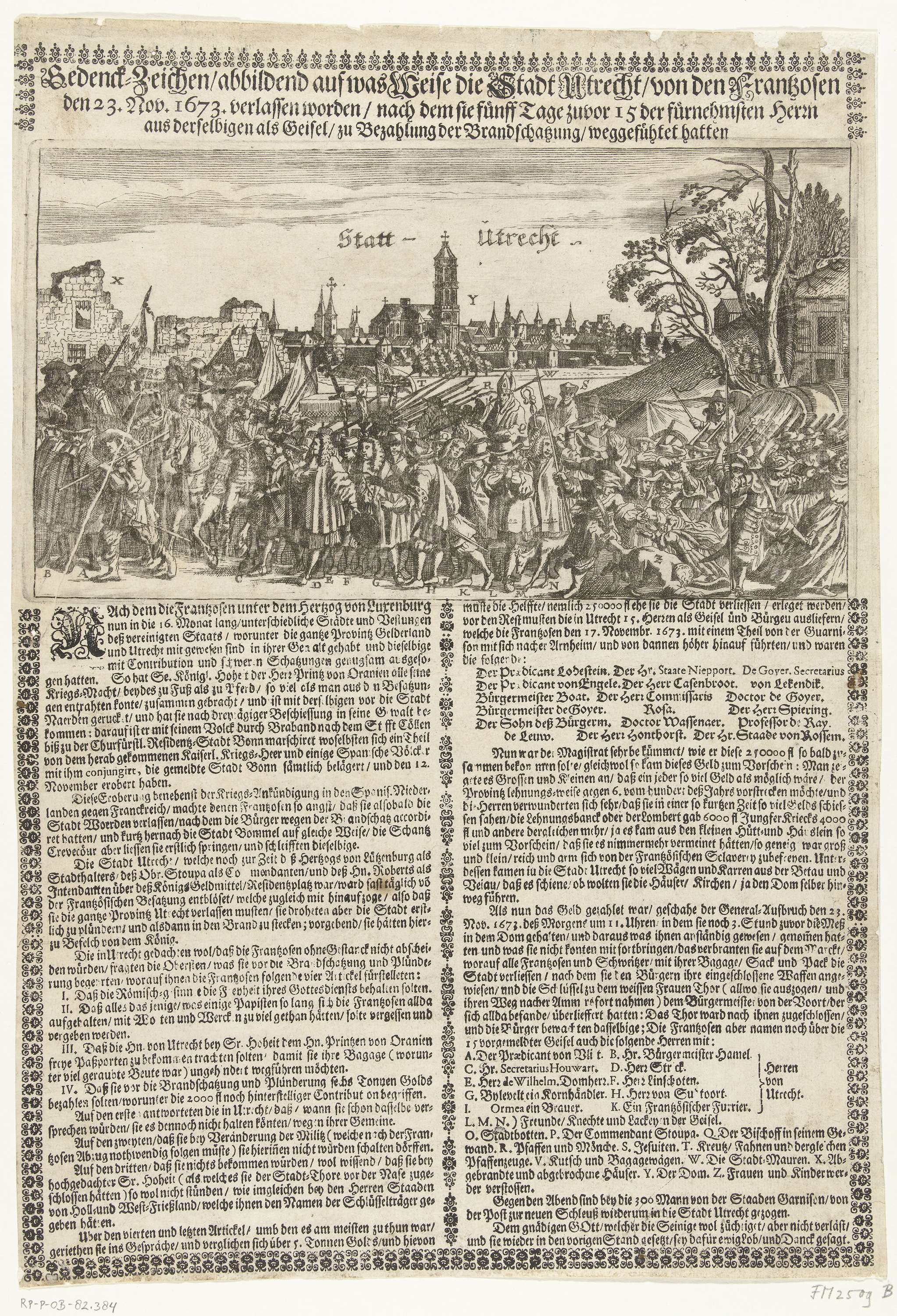 Uittocht van het Franse leger uit Utrecht, 1673. Het Franse leger verlaat op 23 november 1673 de stad Utrecht met meeneming van 15 gijzelaars. Op de achtergrond de stad met de Dom, op de voorgrond trekt de stoet langs ruïnes. Onder de voorstelling 2 kolommen tekst met de namen van de gijzelaars en de legenda ...